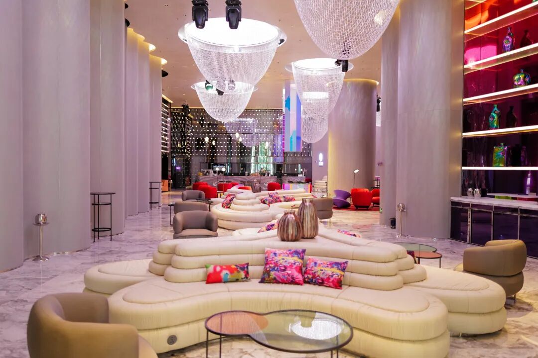 厦门W是我近年来鲜见的将潮堂设置在地面层的W酒店,在进入其由感应玻璃移门守护的挡风厅后,接待台和休憩席共同舒展于挑空3层的底部空间中。我办理入住时恰逢周末下午,在前台办理入住手续时,即可近距离目睹大批精心修饰的本地潮流人士,占满了潮堂悦境内一条条线条优美流畅的沙发长榻。
