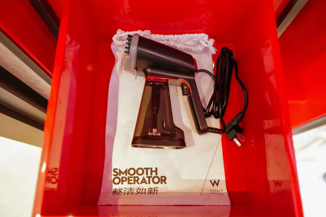 在厦门W,无论何种房型都会配备一面RGB互动画布墙,借助三原色光影的交替,会叙述关于厦门的某一角度的故事,红色是乘风破浪的行船、蓝色是白鹭鸟栖息地、绿色则是郁郁葱葱的海上园林。我的RGB墙幕背后是一座全红色烤漆镶板围拢的八角形衣帽间(红色刚好象征着厦门市花凤凰花)。