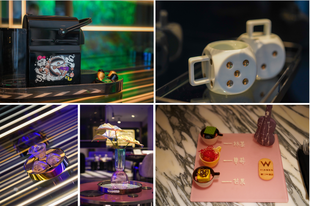 ▲ 带有手绘外壳和特质胶囊托盘的Nespresso咖啡机、骰子造型的马克杯、逗趣的欢迎甜品、插有金属叶子的花瓶、极具W精神的中式茶具组。