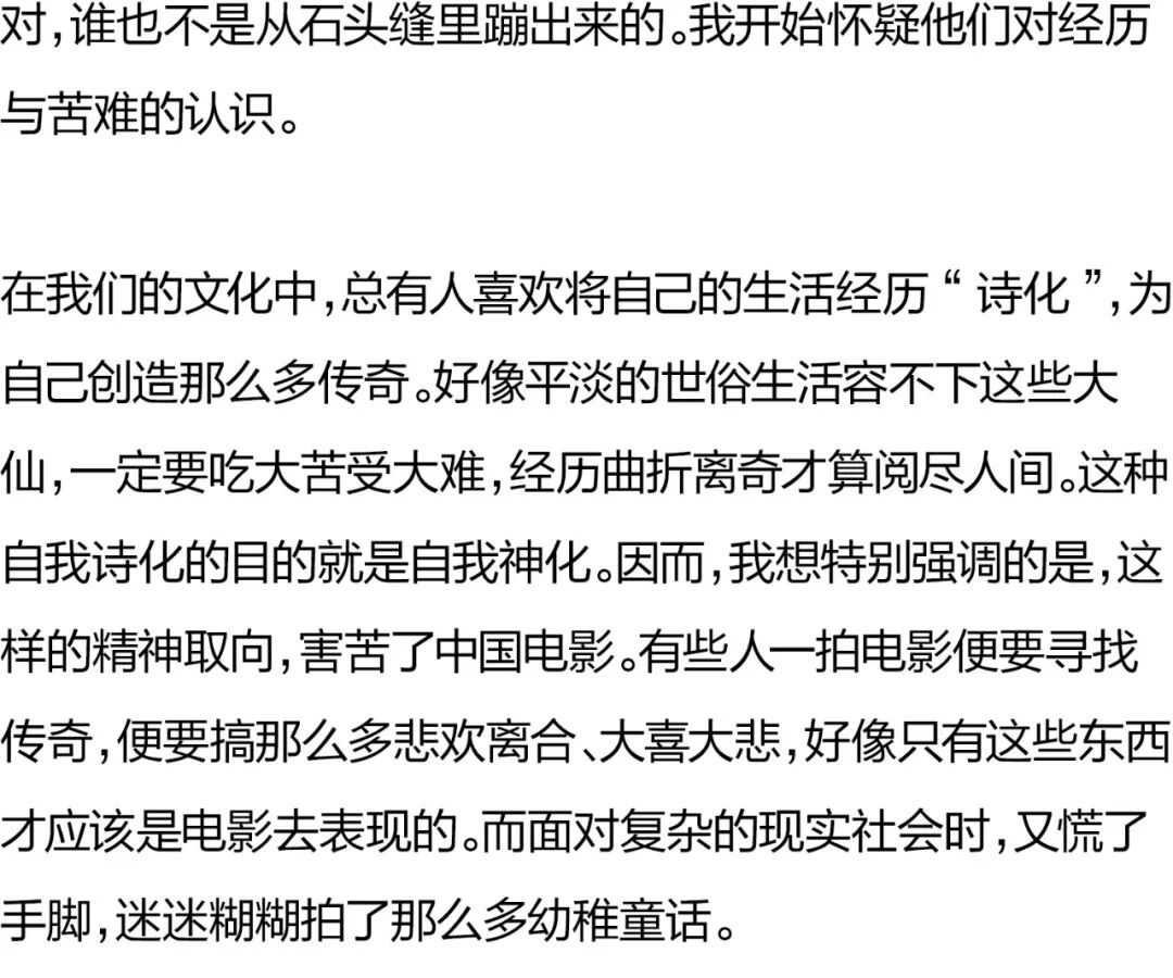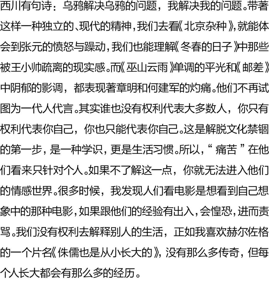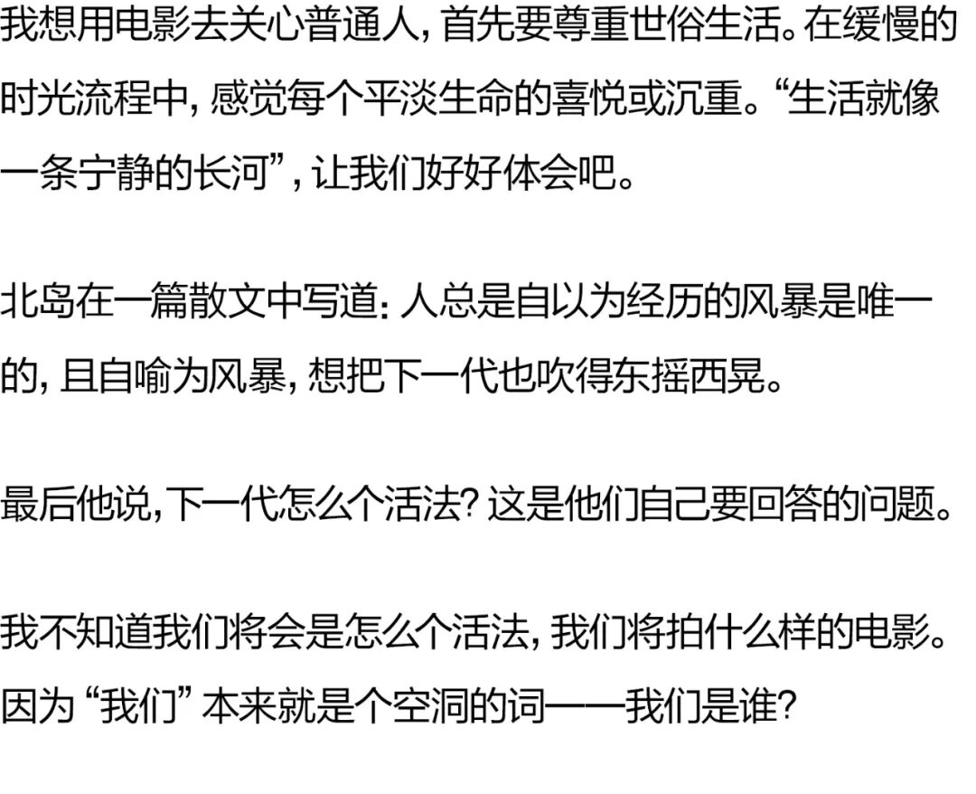 在阅读和观看贾樟柯的过程中,我发现他始终想表达的观点就是:个体经验的珍贵。这些个体是什么样的呢?没那么复杂,也不深刻,也不含蓄。他们不试图去感染别人,不解释不煽情不落泪,只是沉甸甸存在过,存在着。