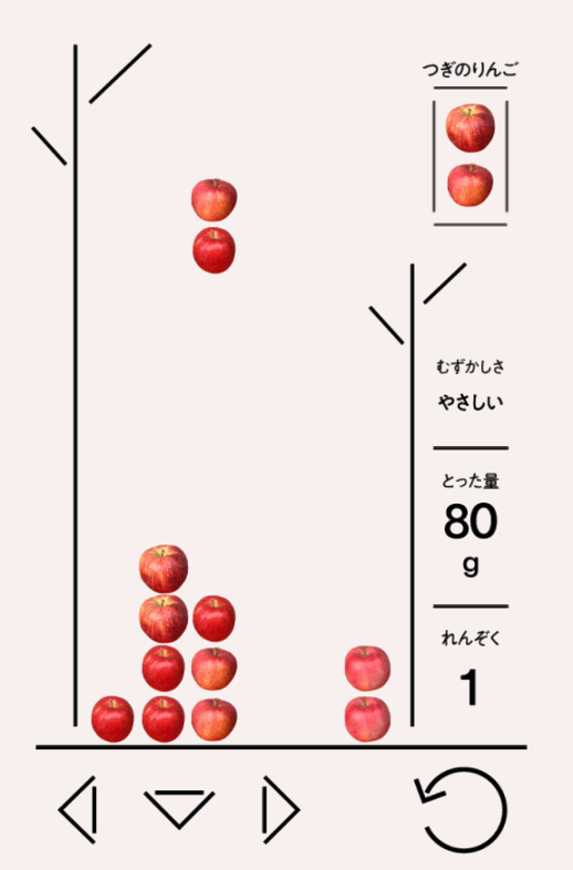 屏幕的三个按键分别是“简单、通常和困难”,右上角提示是“下次掉落的苹果”,往下分别是“难度”“获得量”“连击”。