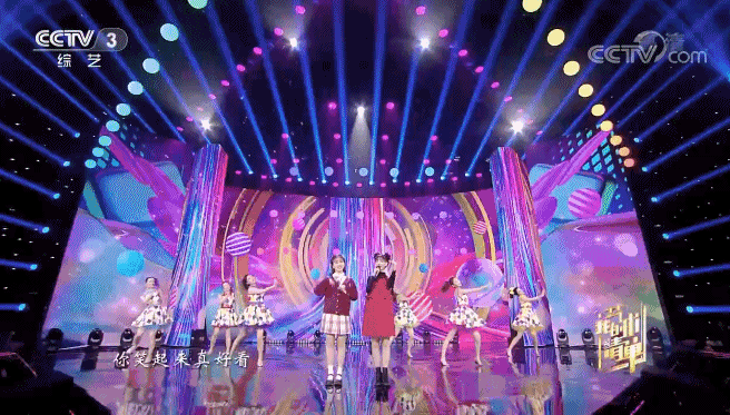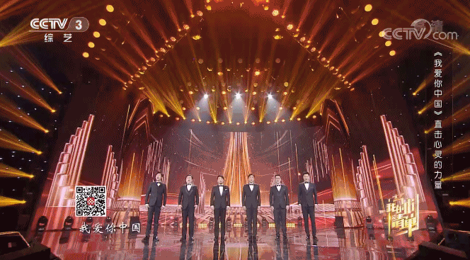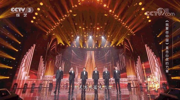《我爱你中国》开合屏的舞台设计,抽象的红白线、粒子,渲染出红色主旋律。