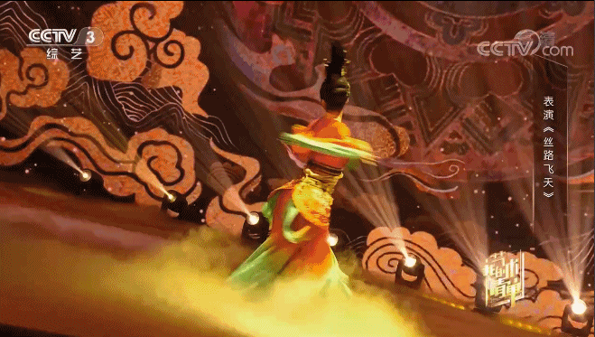 一把琵琶展现敦煌壁画飞天的妖娆,在转身、回眸,仿佛壁画中的飞天来到人间,一曲千年,穿越古今。舞台上敦煌壁画元素,烟雾特效让敦煌神秘,在舞者演绎中,敦煌的壁画好像从琵琶声中流淌在观众眼前。
