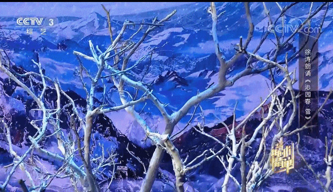 舞台上雪花纷纷扬扬的飘洒,近处的枯枝,远处的雪山清晰可见,纯意境的舞台,开阔的视野,带来震撼的视觉效果,正如毛泽东的诗词描述的祖国的壮美、宏大。