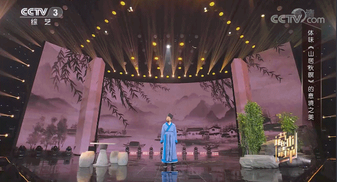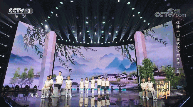 唐代诗人王维的《山居秋暝》以文字描绘了一番秋景,成为对山居秋景的寄情表达。“诗中的‘秋暝’二字对何家英来说非常重要。他的另一幅画《十九秋》,这个名字也是从诗词中得来的”。古典村落、云层在舞台勾勒出一幅秋景图,这里不仅有朗朗的诗歌声,更有舞蹈。