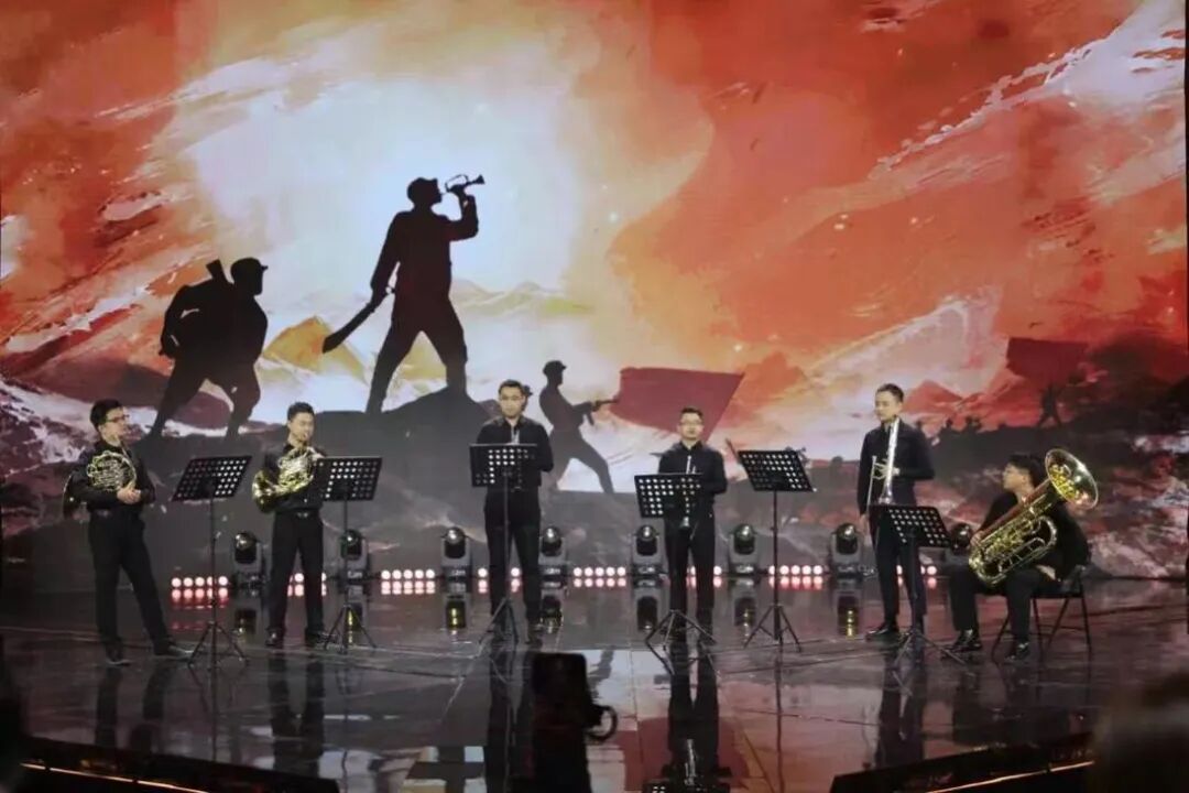 《亮剑》是一部深受“中国男人”喜欢的电视剧。林宝军追剧,更追“亮剑精神,那是一种狭路相逢勇者胜的精神。五乐铜管五重奏《中国军魂》呈现在舞台上, 战争背景,硝烟、旗帜 ,仿佛给人一种战胜一切的勇气。