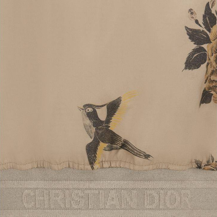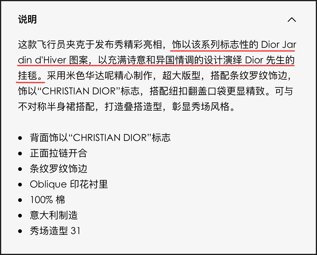 跟马面裙如出一辙,商品说明里也是只字未提有借鉴我国传统文化花鸟工笔画,而是称:饰以该系列标志性的Dior Jardin d'Hiver(冬日花园)图案。