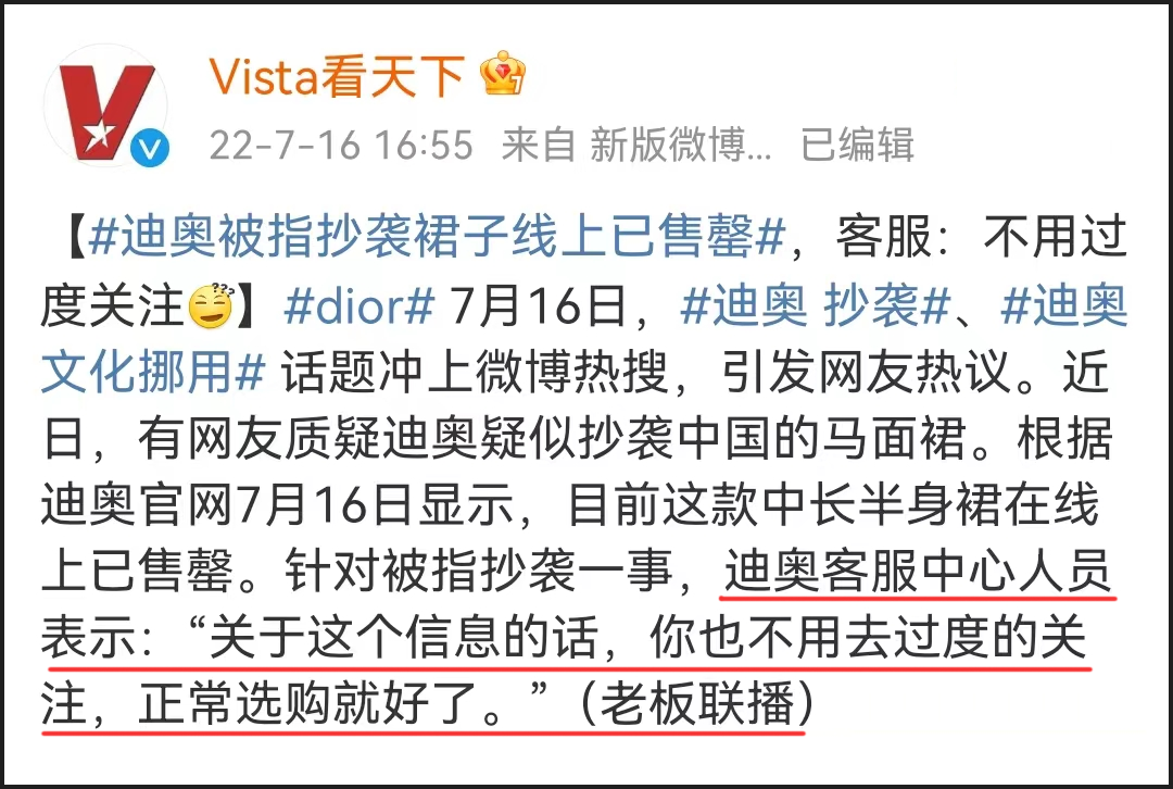 然而目前为止,迪奥也不过是只下架中国区域内的抄袭商品、宣传中绝口不提对于中国文化元素的借鉴和灵感来源。