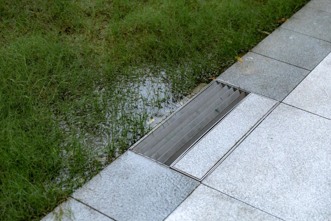 硬质铺装与绿地衔接的平道牙设置也经过精心地推敲与设计。雨天,道路上的积水顺着高差自然的排向雨水花园内,节省掉为道路设计排水系统的费用。同时,大面积绿地的积水也会形成天然的排水系统,有效防止内涝。