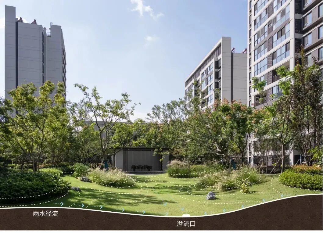 为了保证室内良好采光以及南阳台的视线的观感,建筑南侧采用自然式下凹处理手法,利用草本植物、水生植物、多年生花境植物进行植物组团搭配,结合砾石带形成雨水花园空间,既增强了宅间花园的景观效果,又便于建筑的排水及周边绿地的雨水收集。