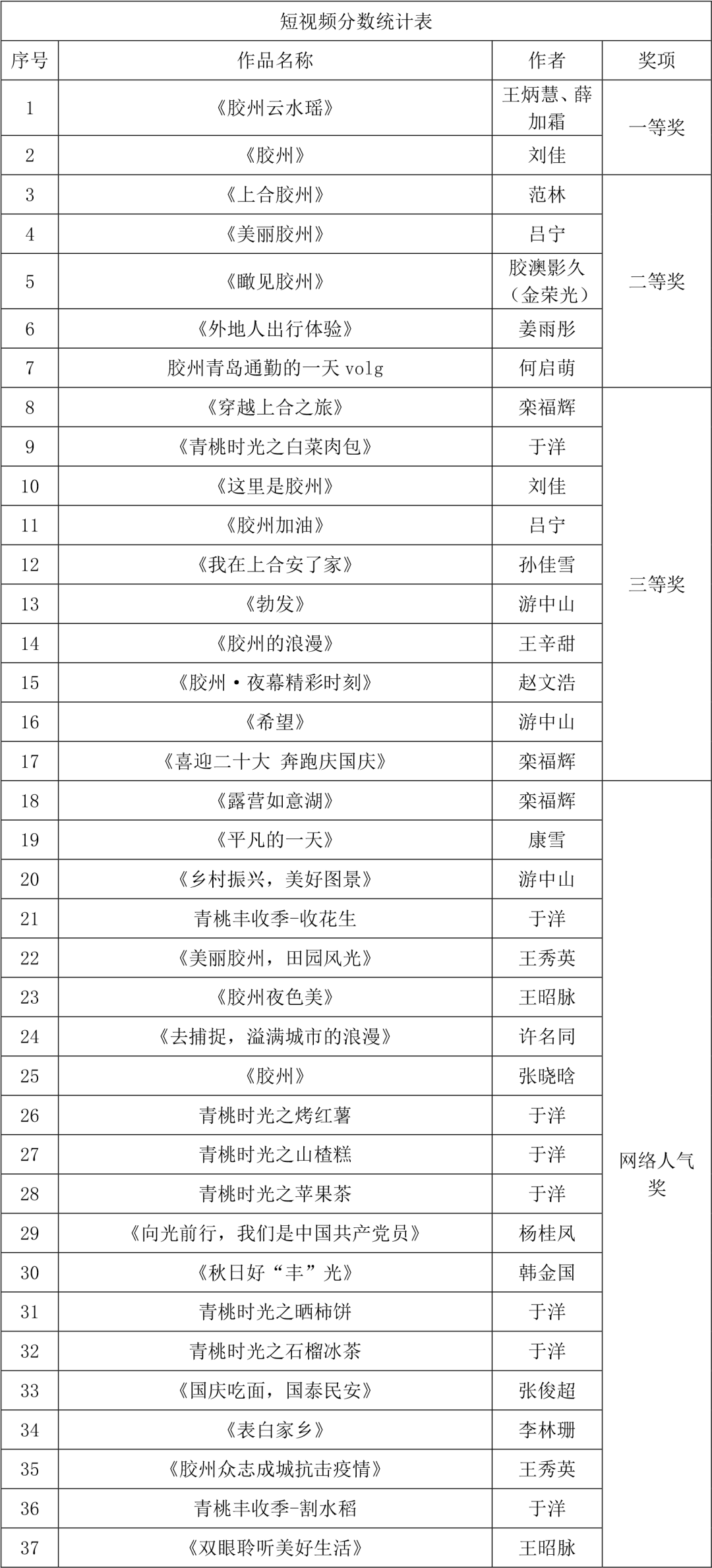 短视频类一等奖2名二等奖5名三等奖10名网络人气奖20名
