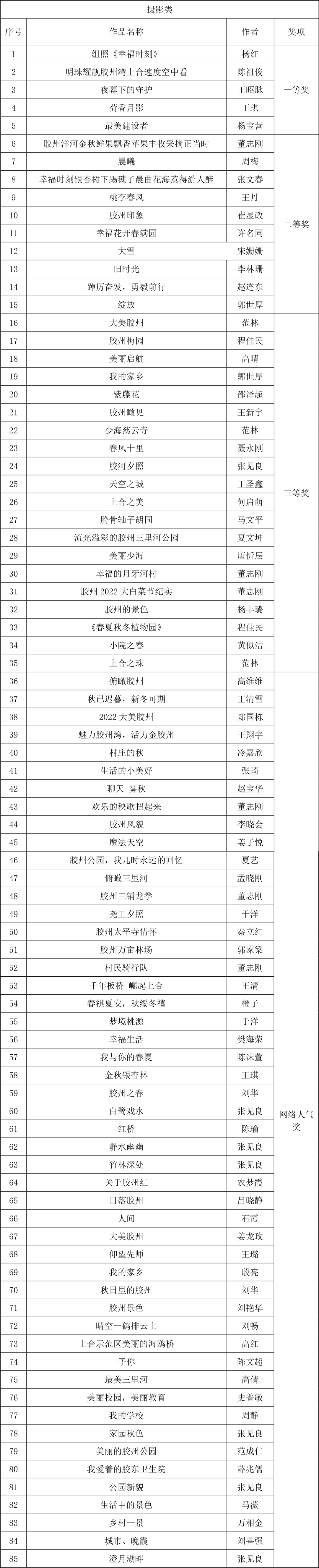 由胶州市委宣传部指导,胶州市融媒体中心主办的“我来表白 精彩胶州 美好生活”主题征集活动,自2022年11月3日正式面向社会公开征集以来,收到广大摄影爱好者的踊跃参与,累计收到照片类作品186份(1027张),短视频作品46个,微电影作品15部,经过“云上胶州”APP展播,专家评审,最终评选出“我来表白 精彩胶州 美好生活”主题获奖作品如下: