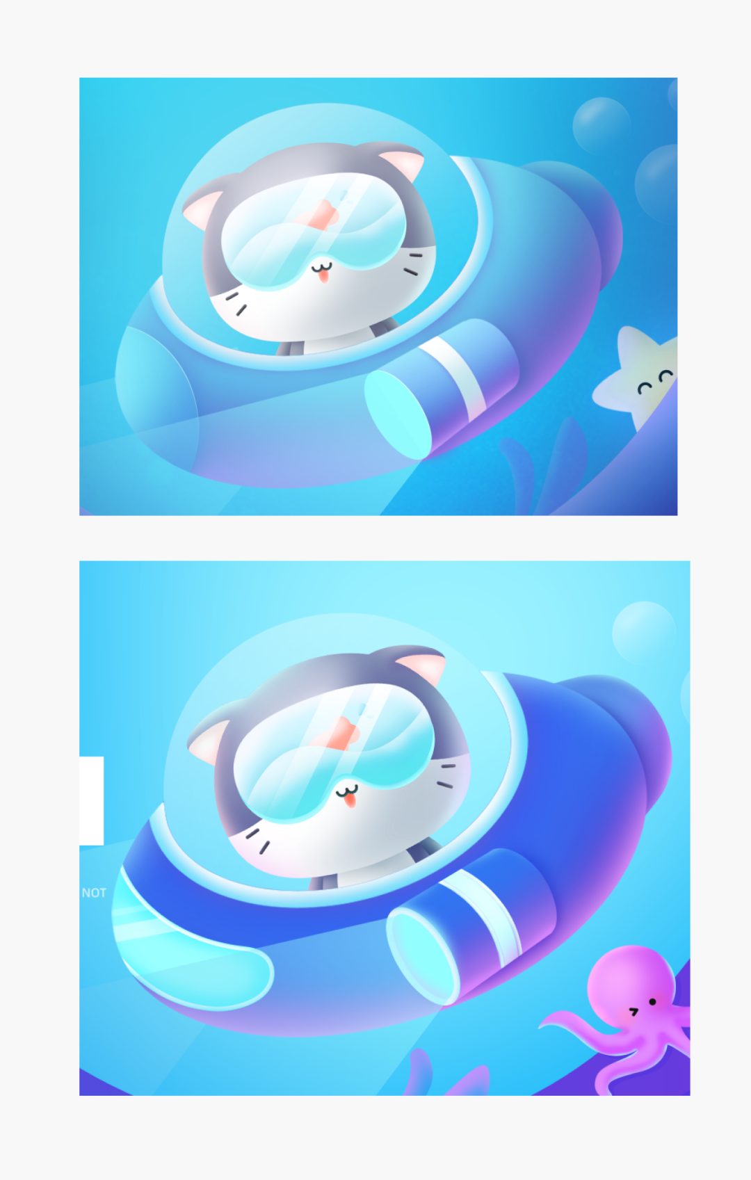 首先,第一个问题,猫有点灰,我们可以把主体适当提高饱和度,颜色再调重一点,让它从背景跳出来,同样的到理,潜艇也可以这样调整,使其跳出来,我们看下前后对比效果: