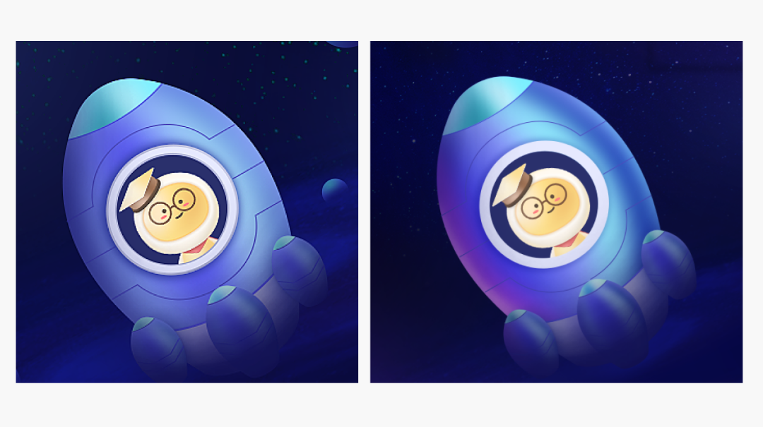 第二个问题,我们来看下主体物,感觉火箭不够立体,有点平,就是因为明暗关系不到位,所以我们可以把明暗拉开一点,多几个明暗的层次,并且色相可以稍微丰富一点,我们看下对比: