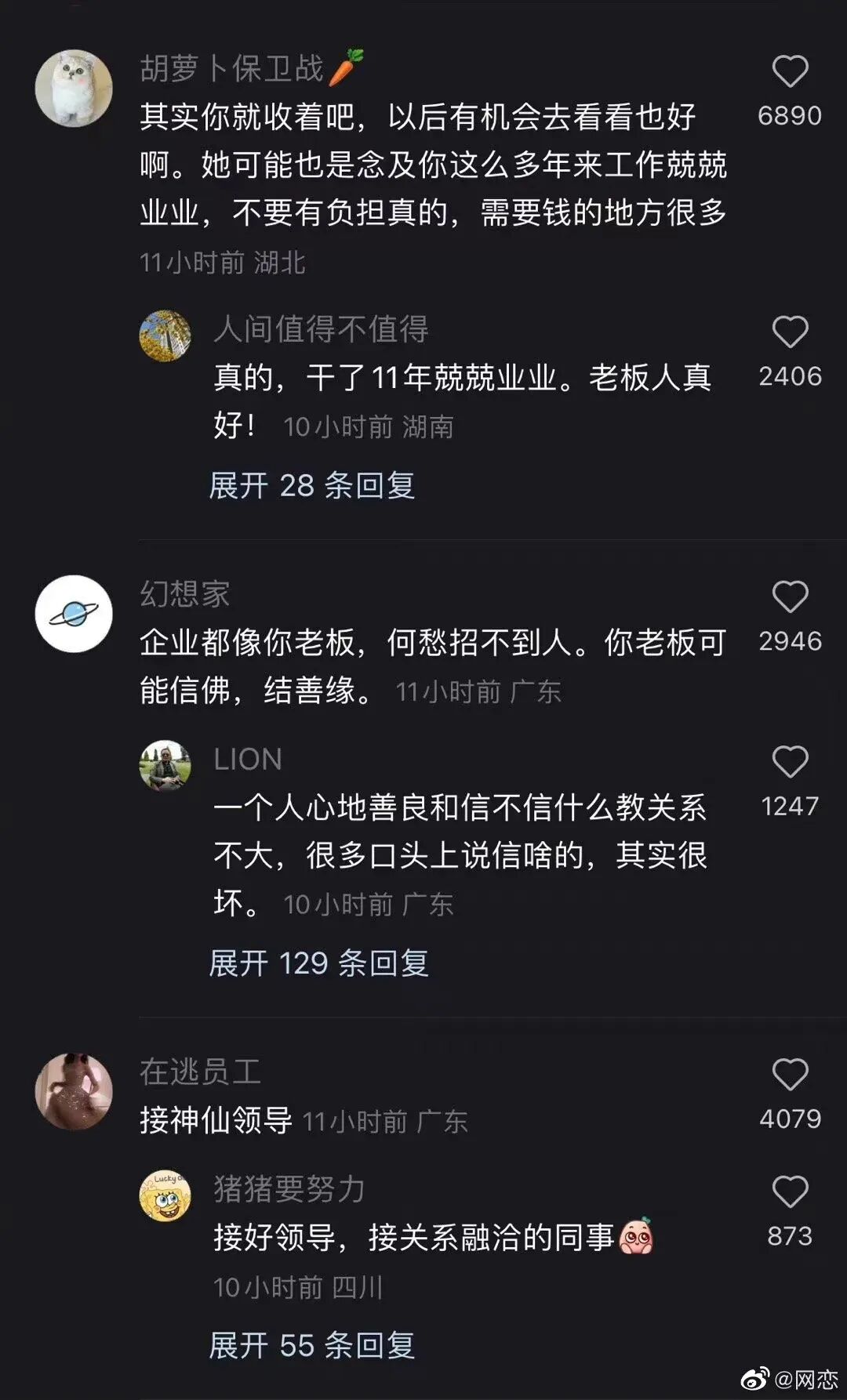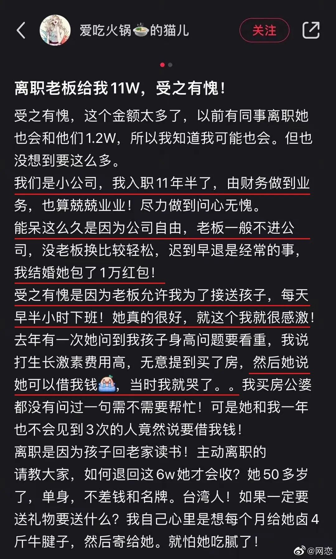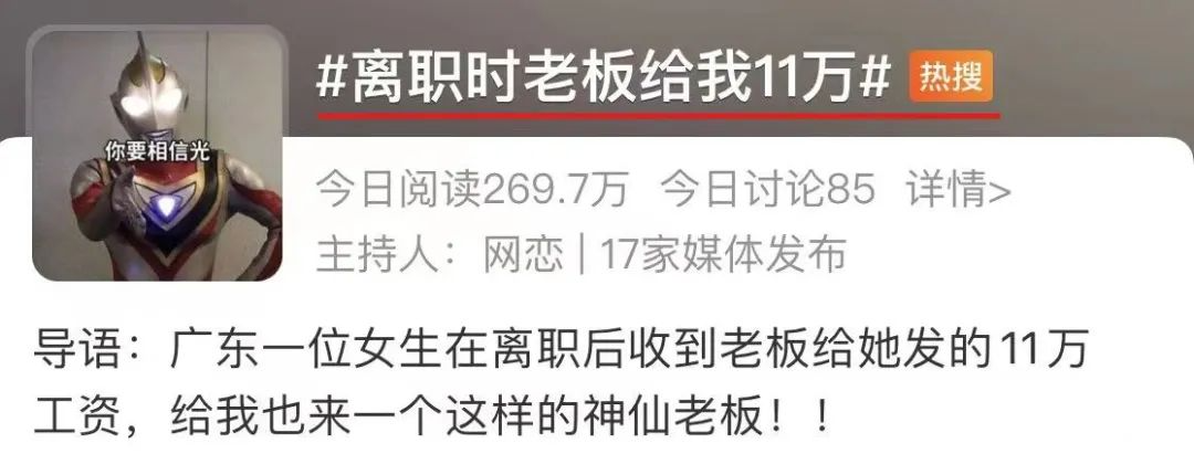 今天有件事上了热搜,某位网友离职时候,老板居然转了11万大红包!!