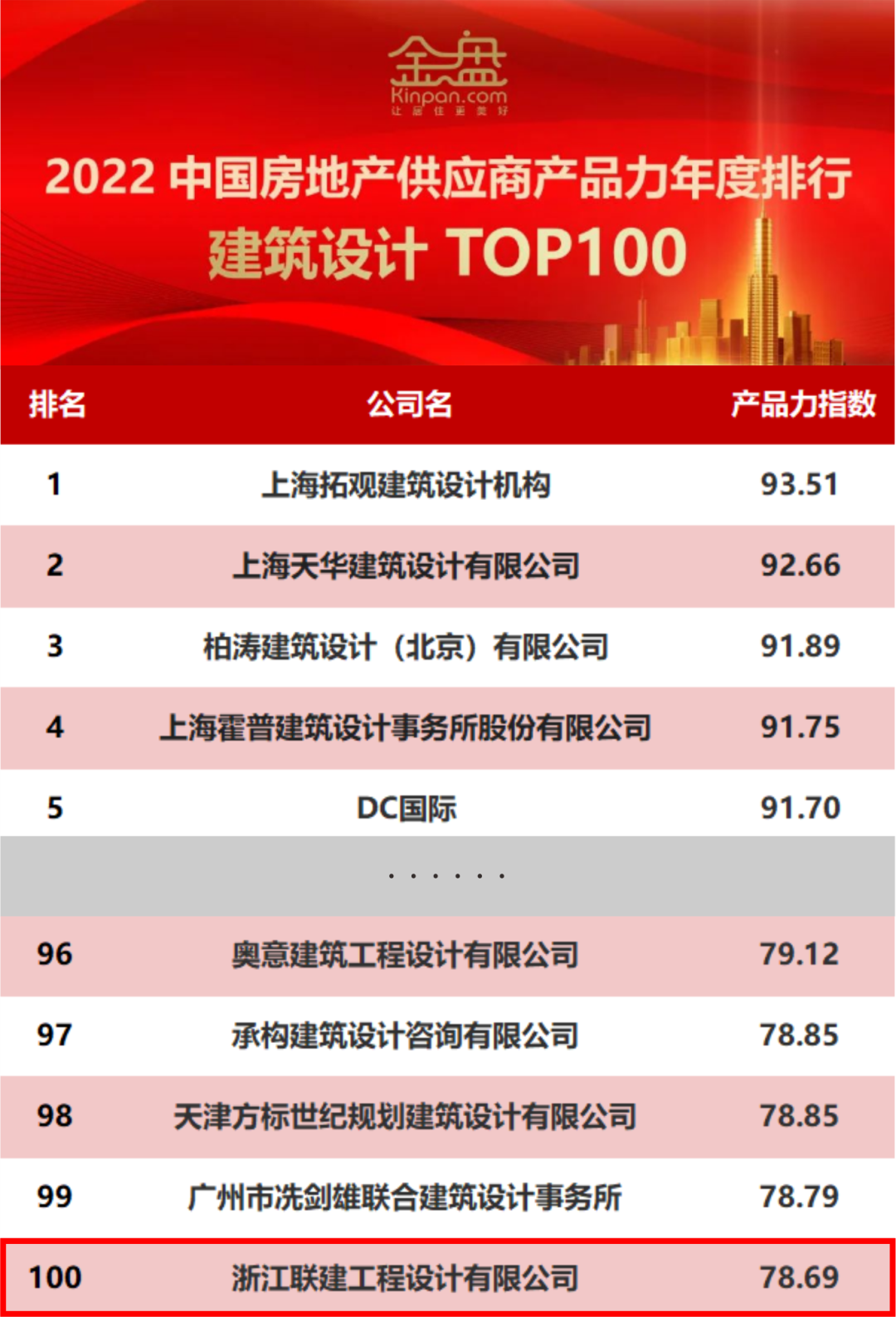 2022年末,中国房地产供应商产品力年度排行出炉,联建设计进入百强。