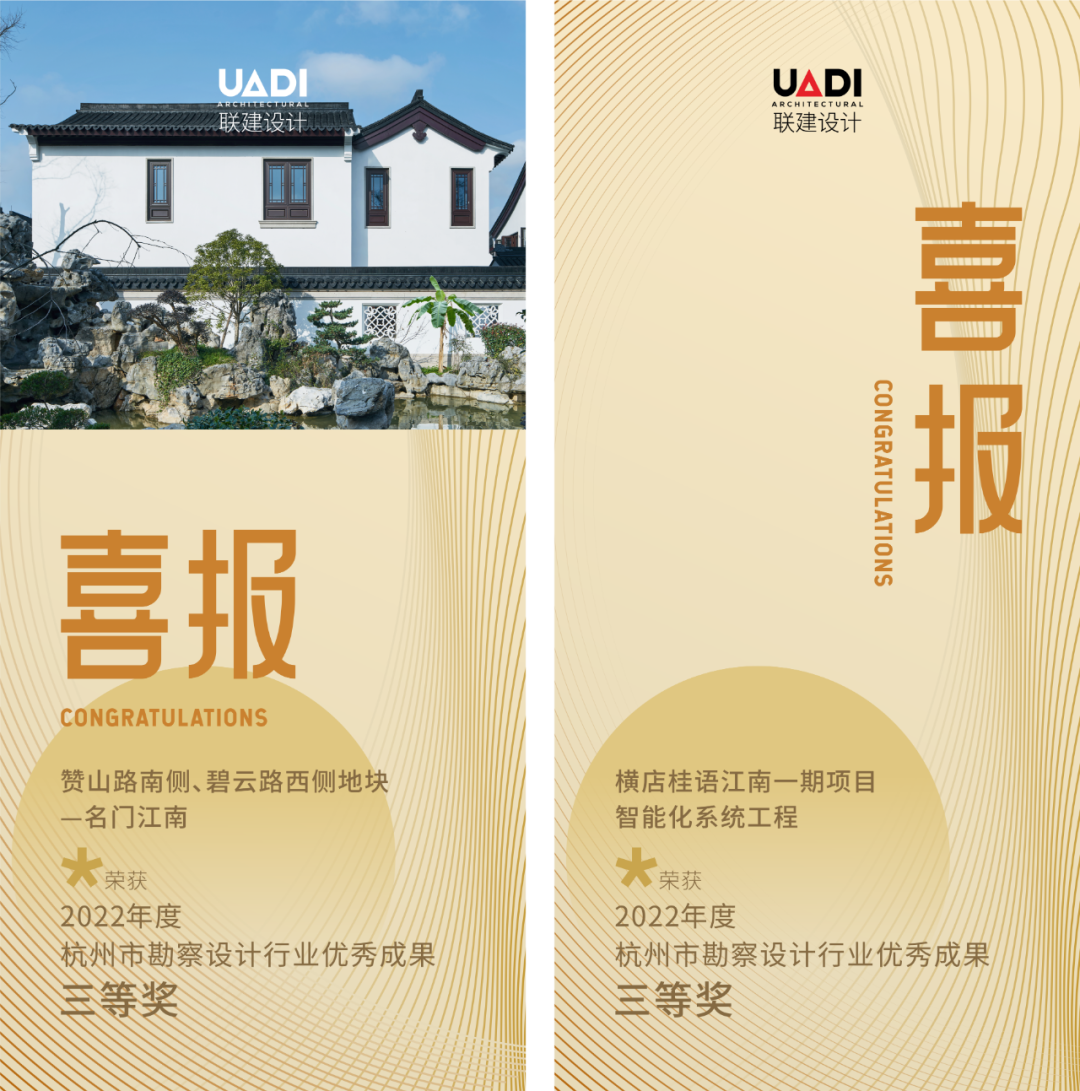 在「2022年度杭州市勘察设计行业优秀成果」评选中,联建设计申报项目「赞山路南侧、碧云路西侧地块(名门·东和园)」、「横店桂语江南一期项目智能化系统工程」分别在建筑和建筑智能化评选类型中获奖。