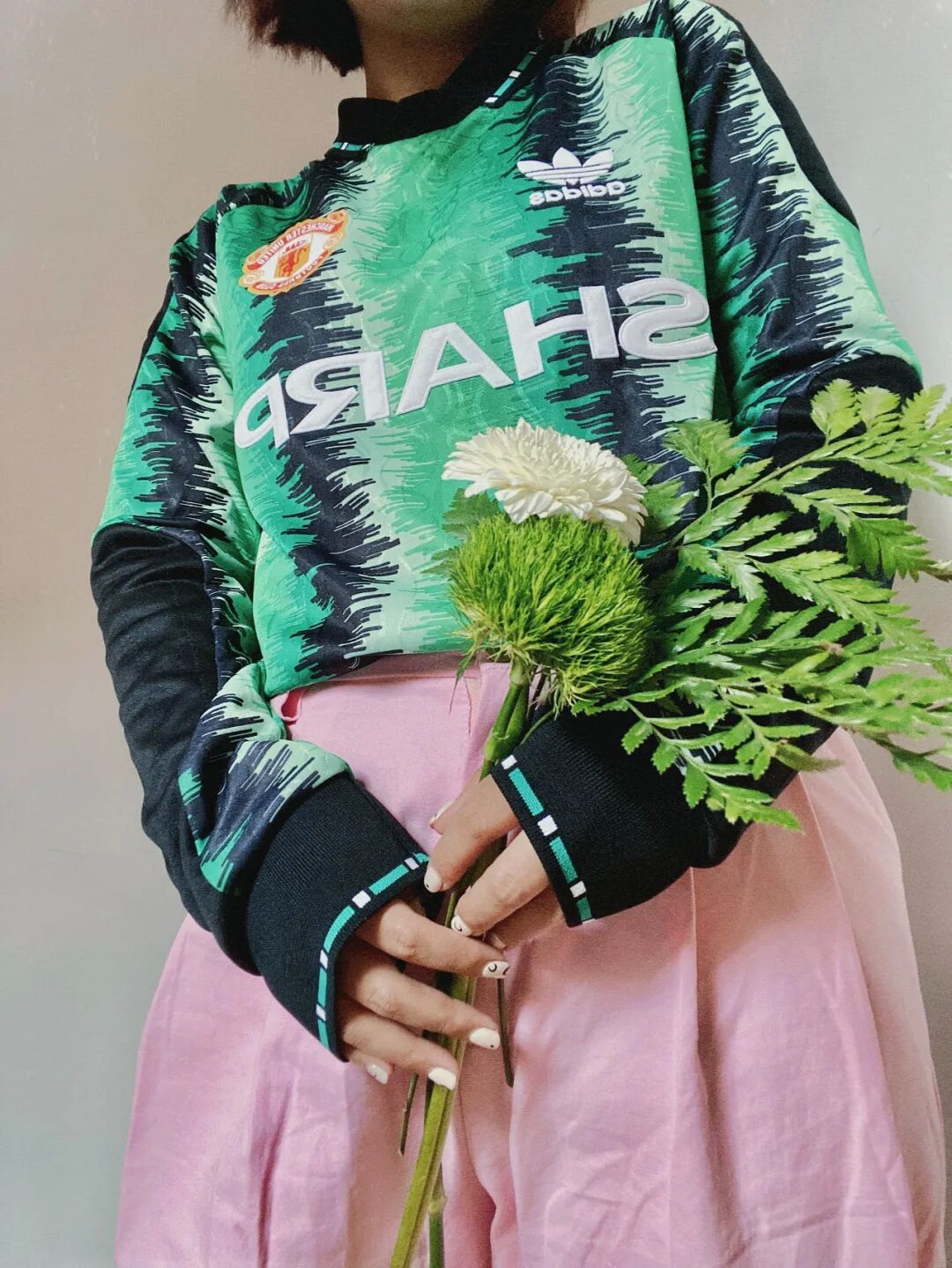 最近 Blokecore 很流行嘛,正好曼联的这件守门员球衣,把绿色的主题和复古完美融合,所以我也索性 Core 一下。
