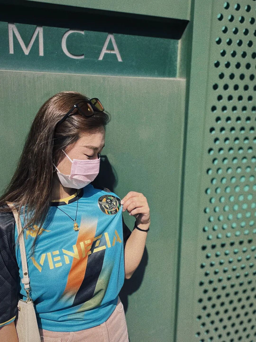 这次出街的球衣搭配秀出我刚到的上赛季威尼斯客场,搭配藕粉色短裙。全身没有过于厚重的色彩,让整个人即使在高温天气也明亮清新。客场的队徽虽不及主场的那样金灿灿,但同样质感满满。