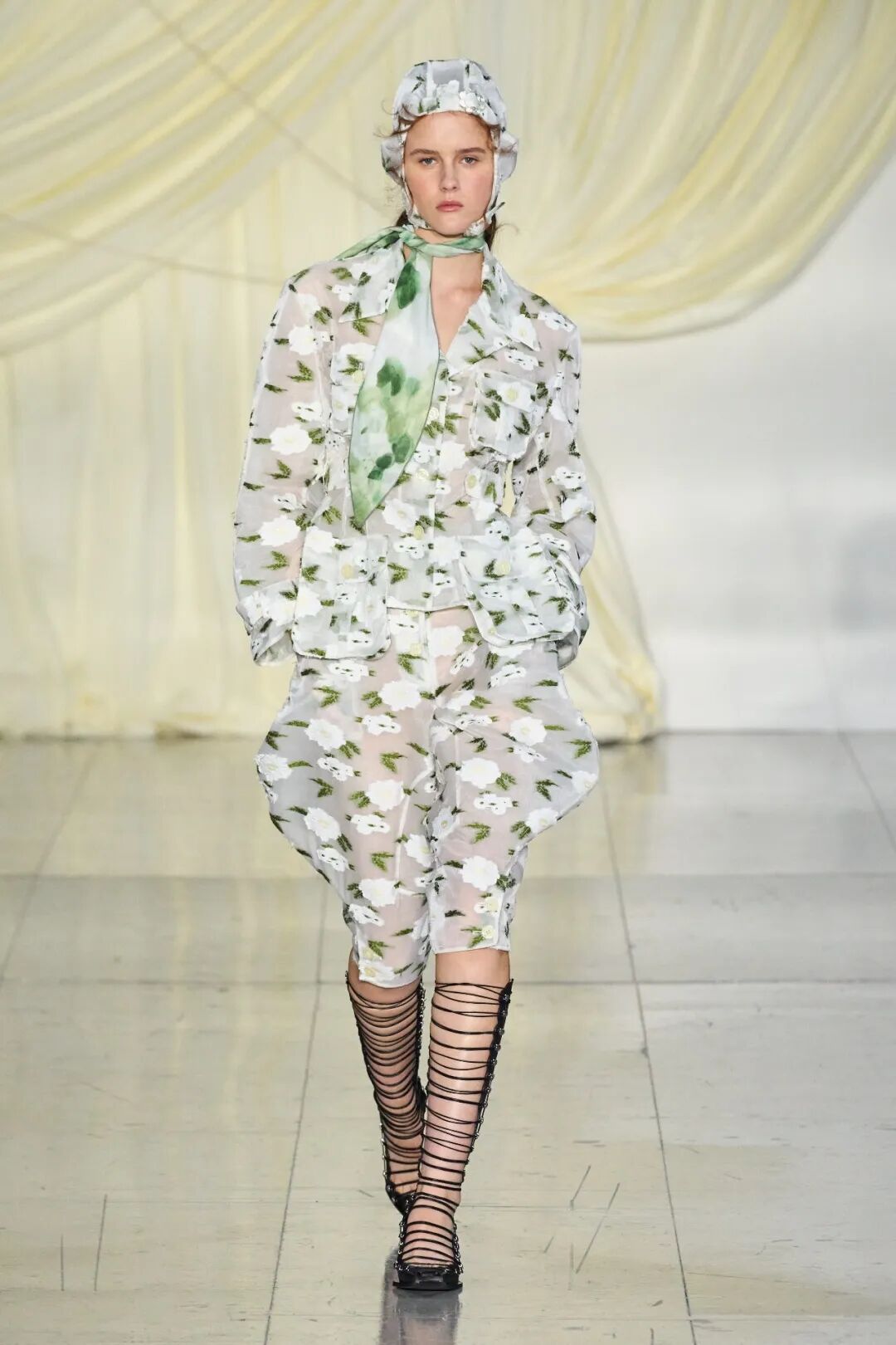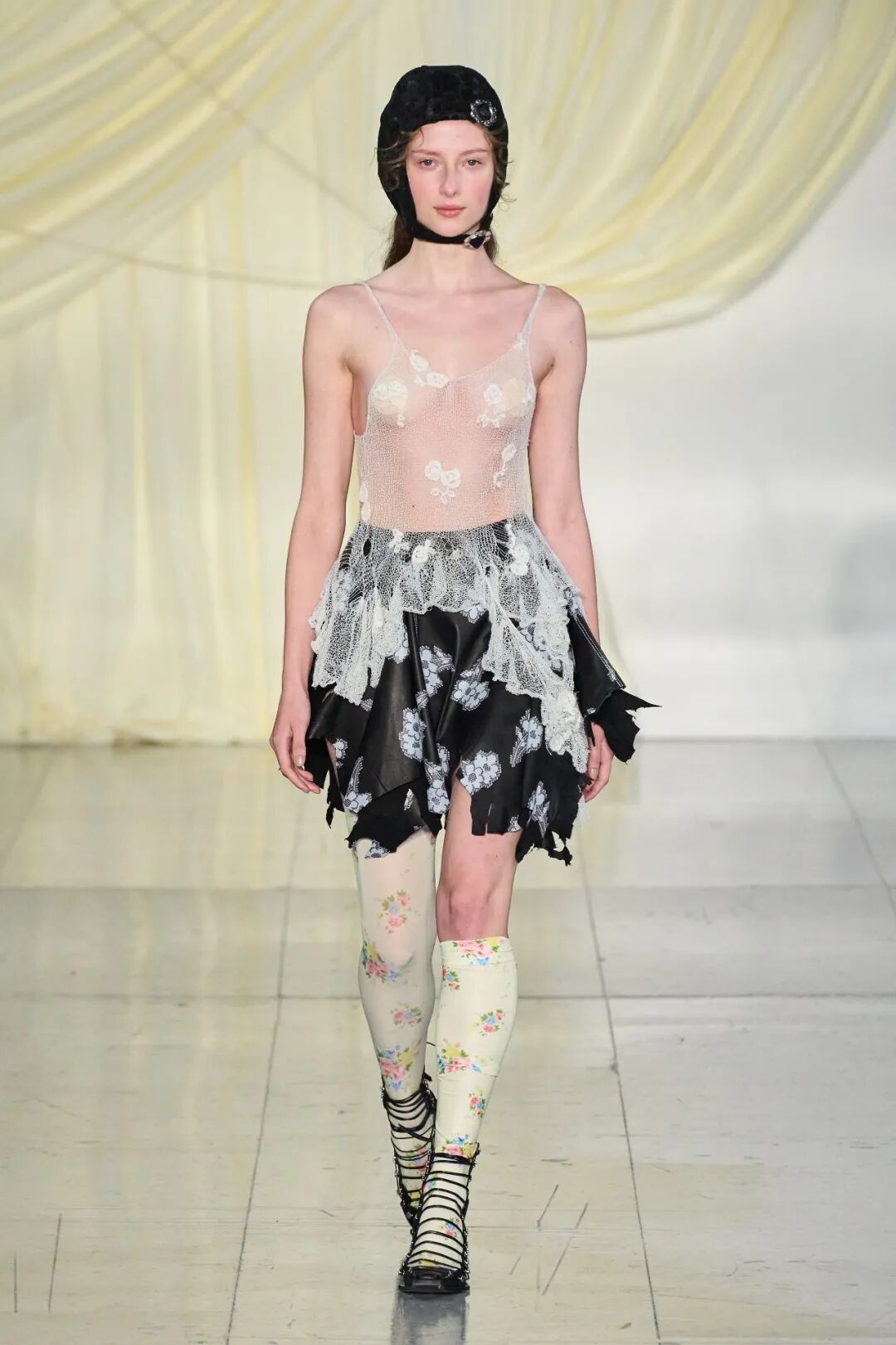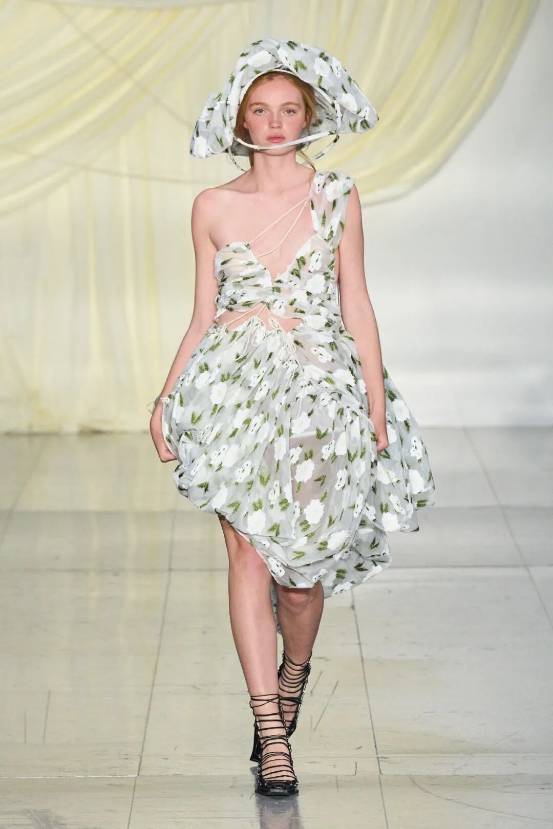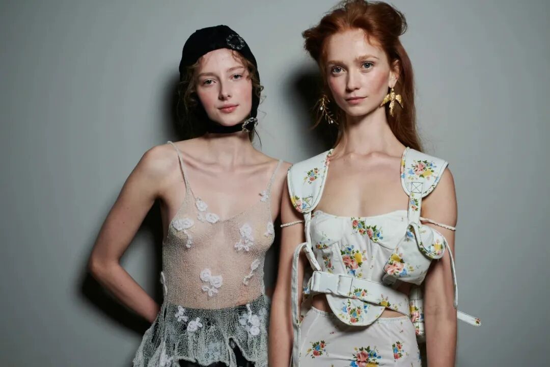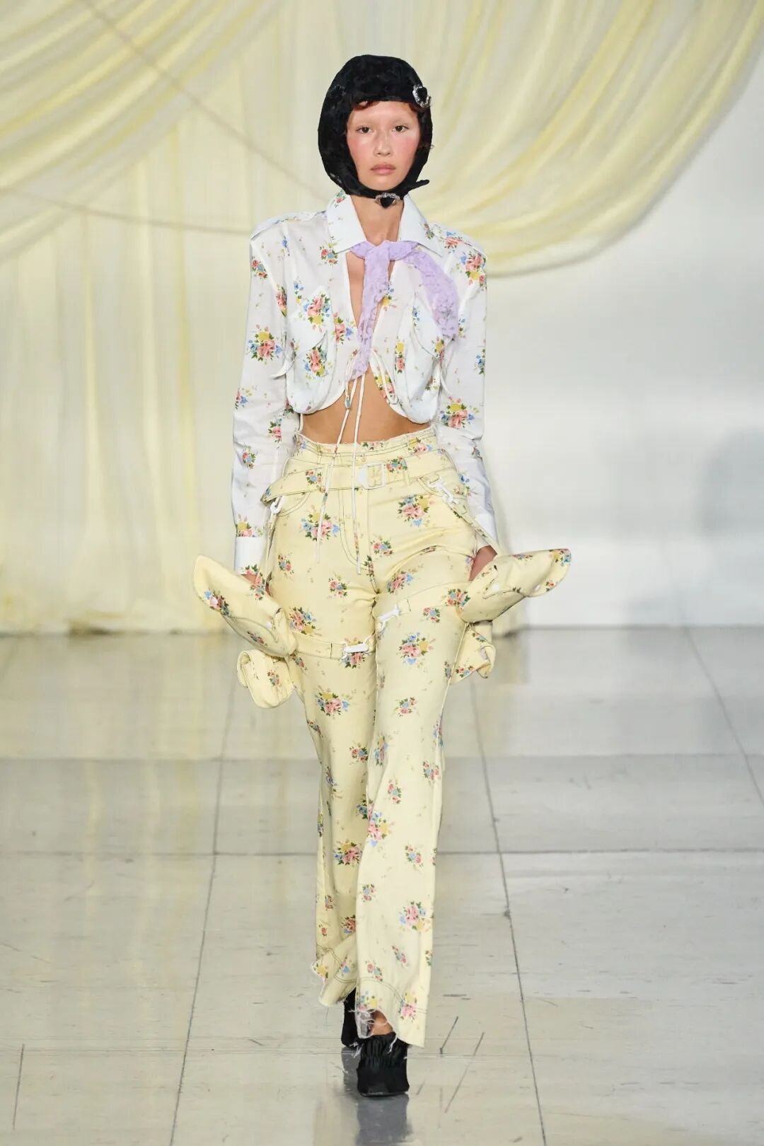飞行员头盔般的头饰配以透视丝质面料,降落伞背包元素结合花卉印花连衣裙,以及在荷叶褶皱、印花拼接、维多利亚时代的束腰上衣中,引入一丝军事参考,Yuhan将两种截然不同的女性气质融合,在刚毅与柔美的碰撞中呈现出独属于Yuhan Wang的浪漫活力。