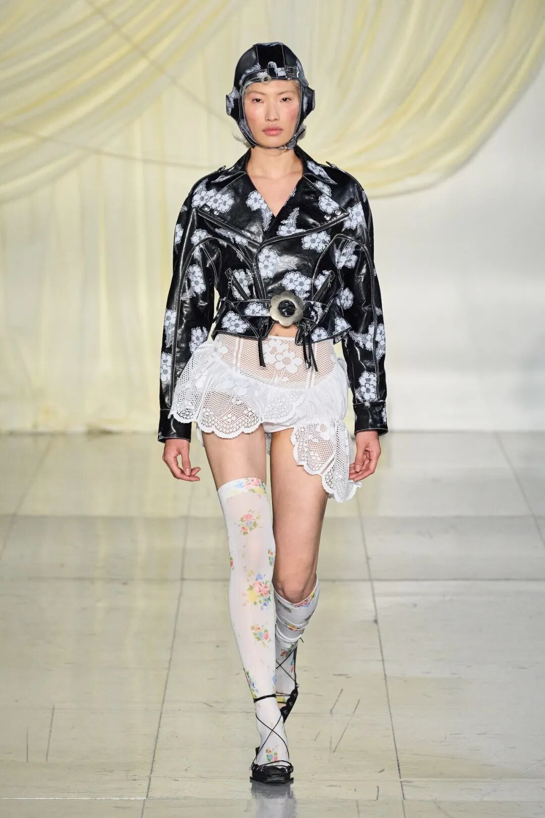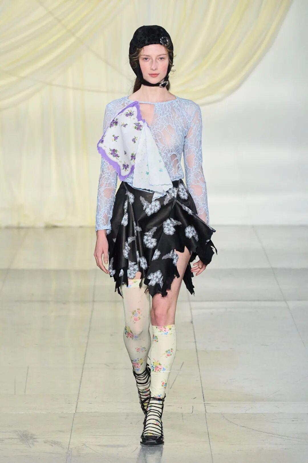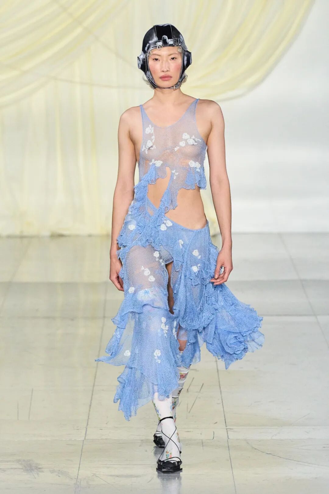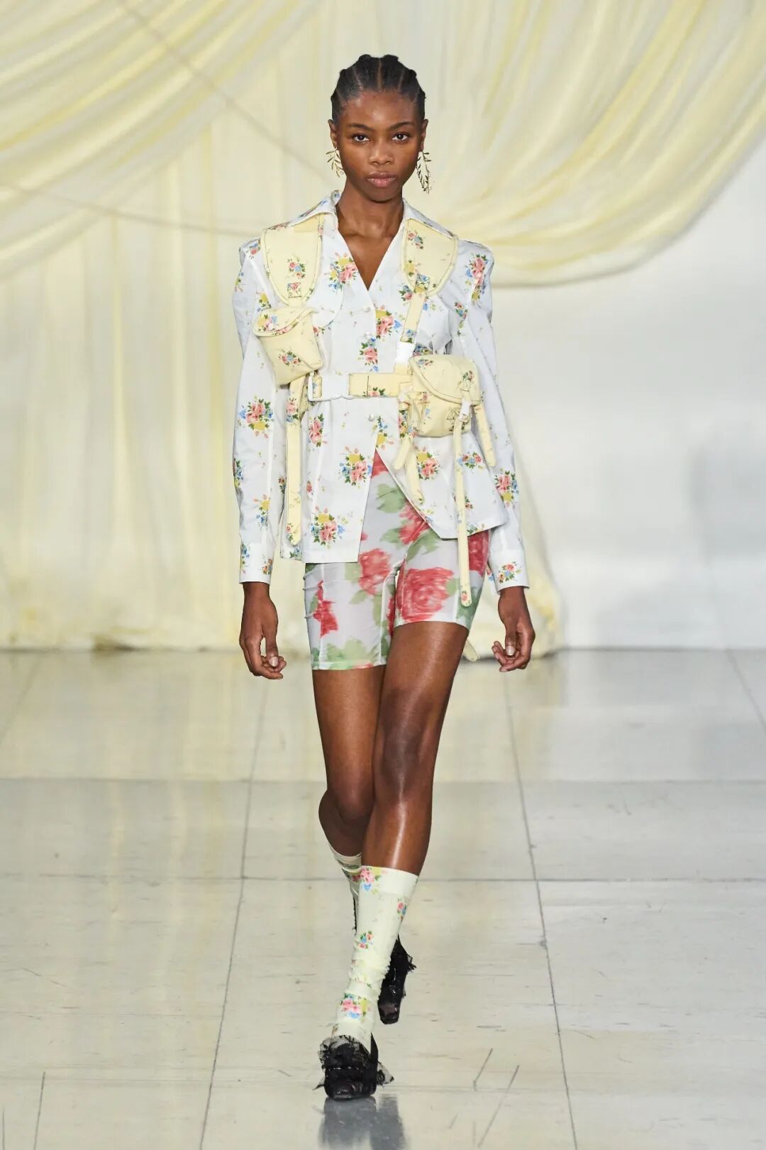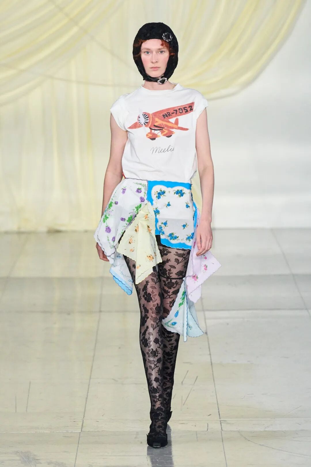 飞行员头盔般的头饰配以透视丝质面料,降落伞背包元素结合花卉印花连衣裙,以及在荷叶褶皱、印花拼接、维多利亚时代的束腰上衣中,引入一丝军事参考,Yuhan将两种截然不同的女性气质融合,在刚毅与柔美的碰撞中呈现出独属于Yuhan Wang的浪漫活力。