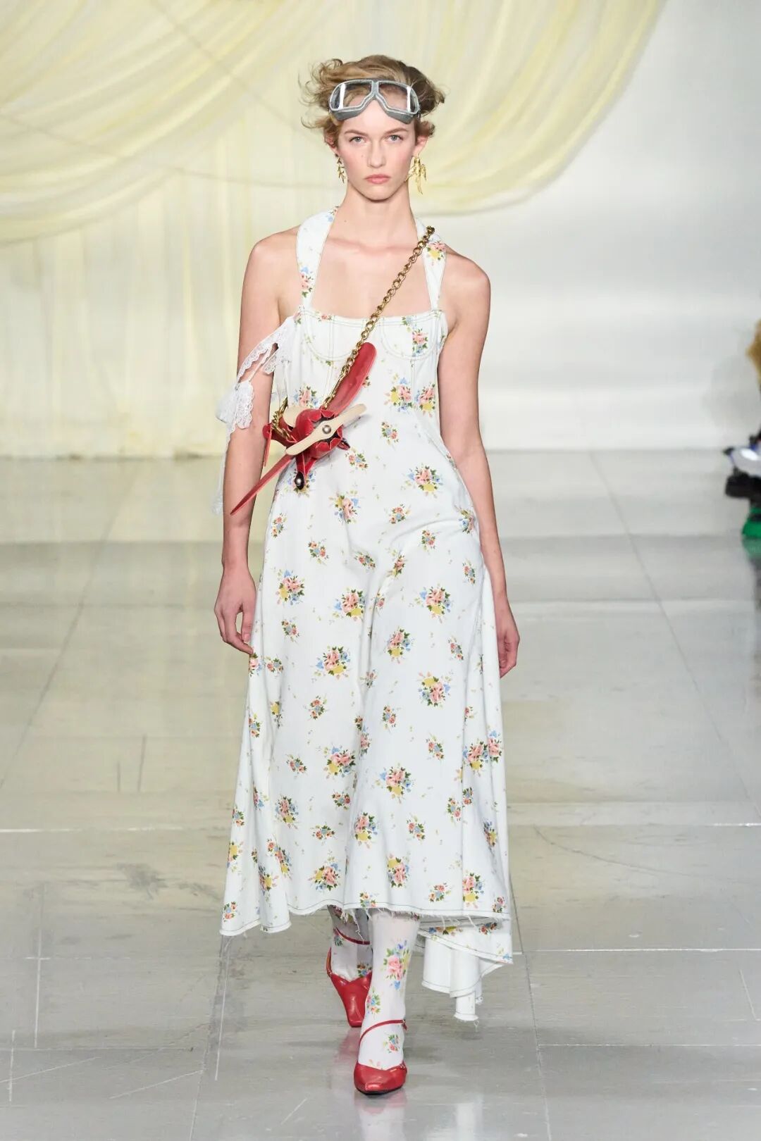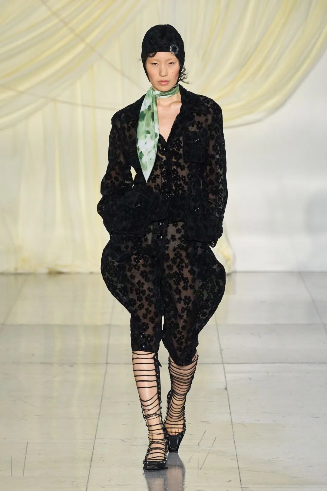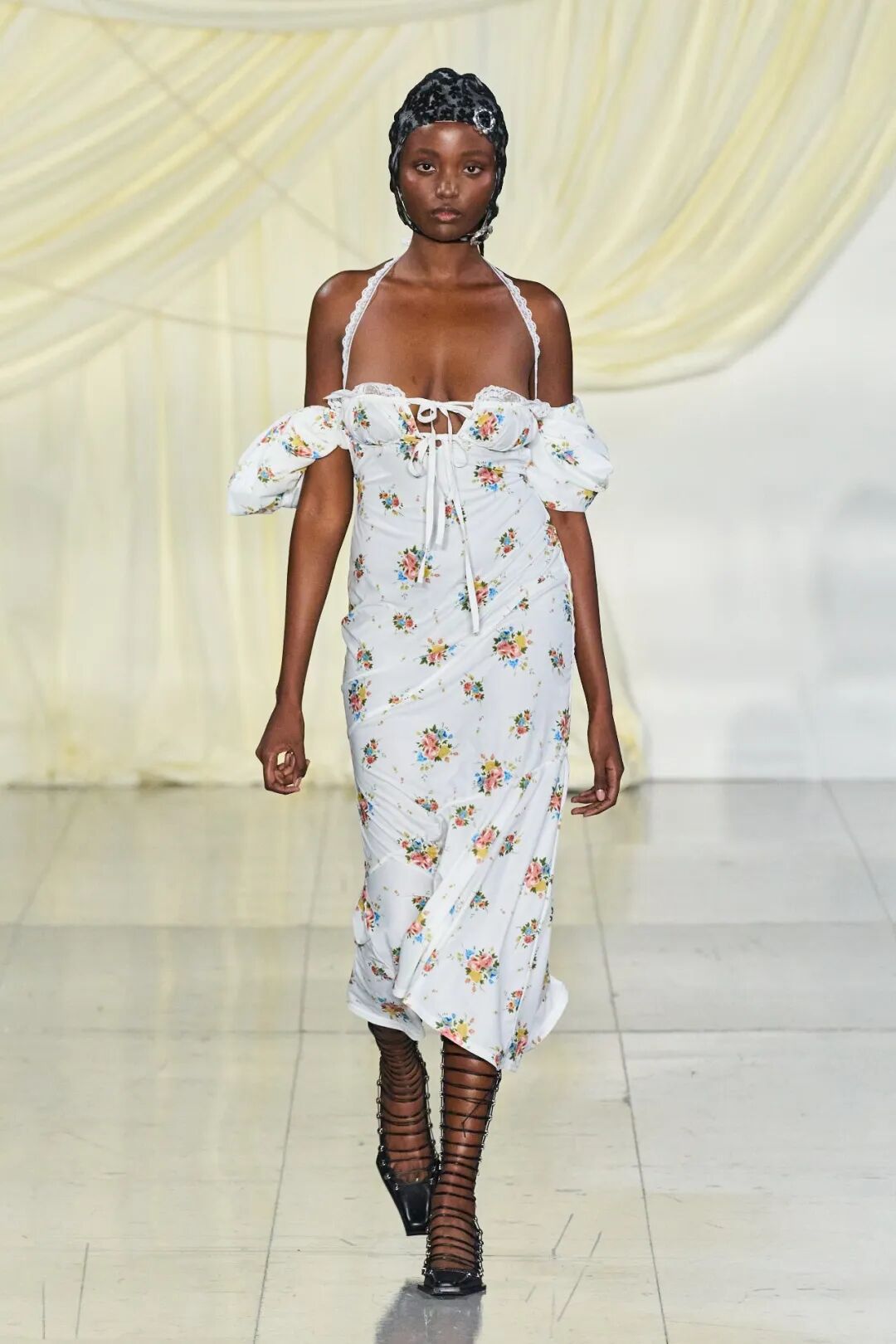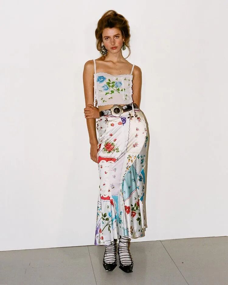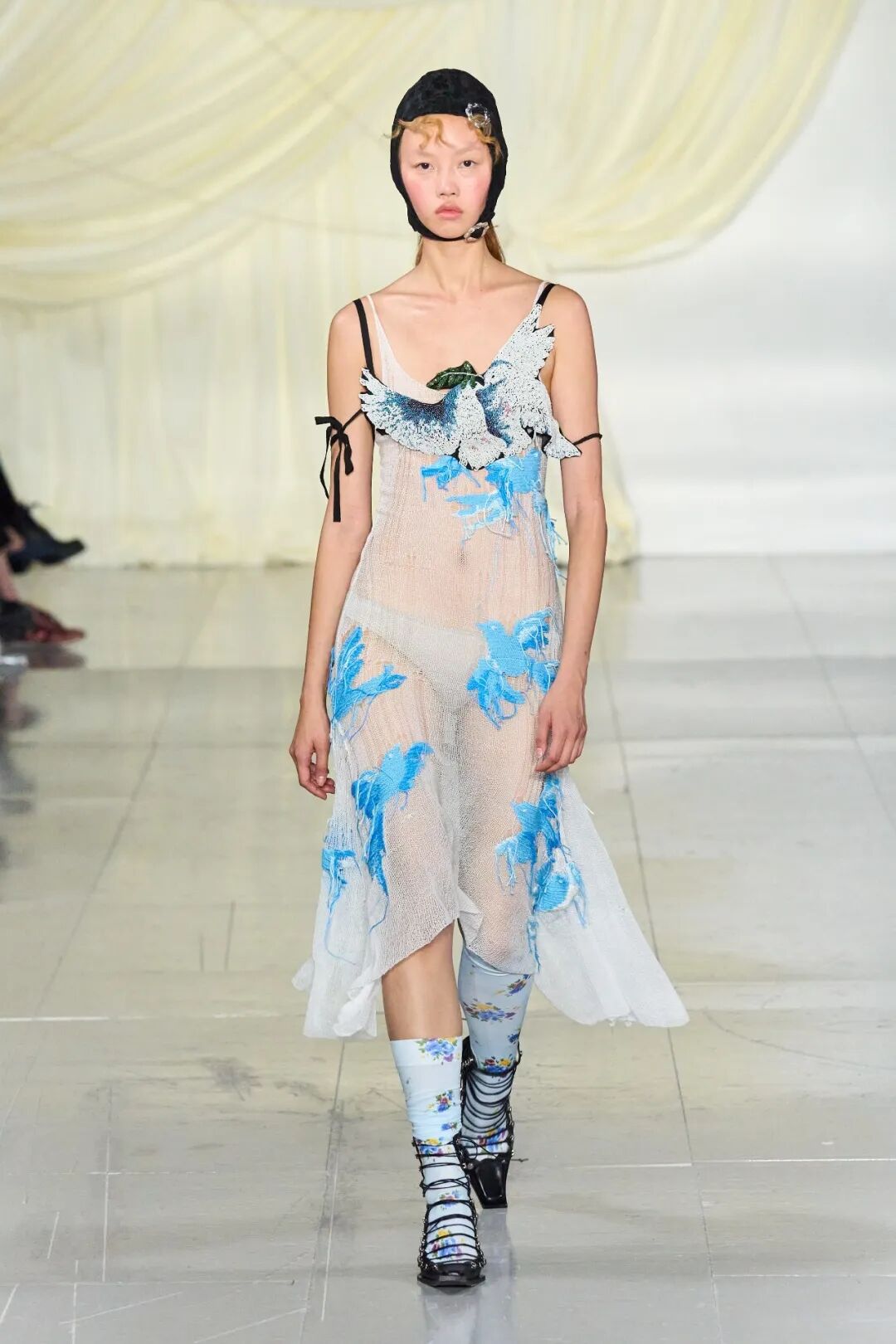 飞行员头盔般的头饰配以透视丝质面料,降落伞背包元素结合花卉印花连衣裙,以及在荷叶褶皱、印花拼接、维多利亚时代的束腰上衣中,引入一丝军事参考,Yuhan将两种截然不同的女性气质融合,在刚毅与柔美的碰撞中呈现出独属于Yuhan Wang的浪漫活力。