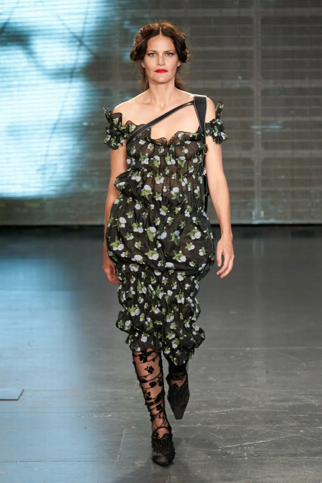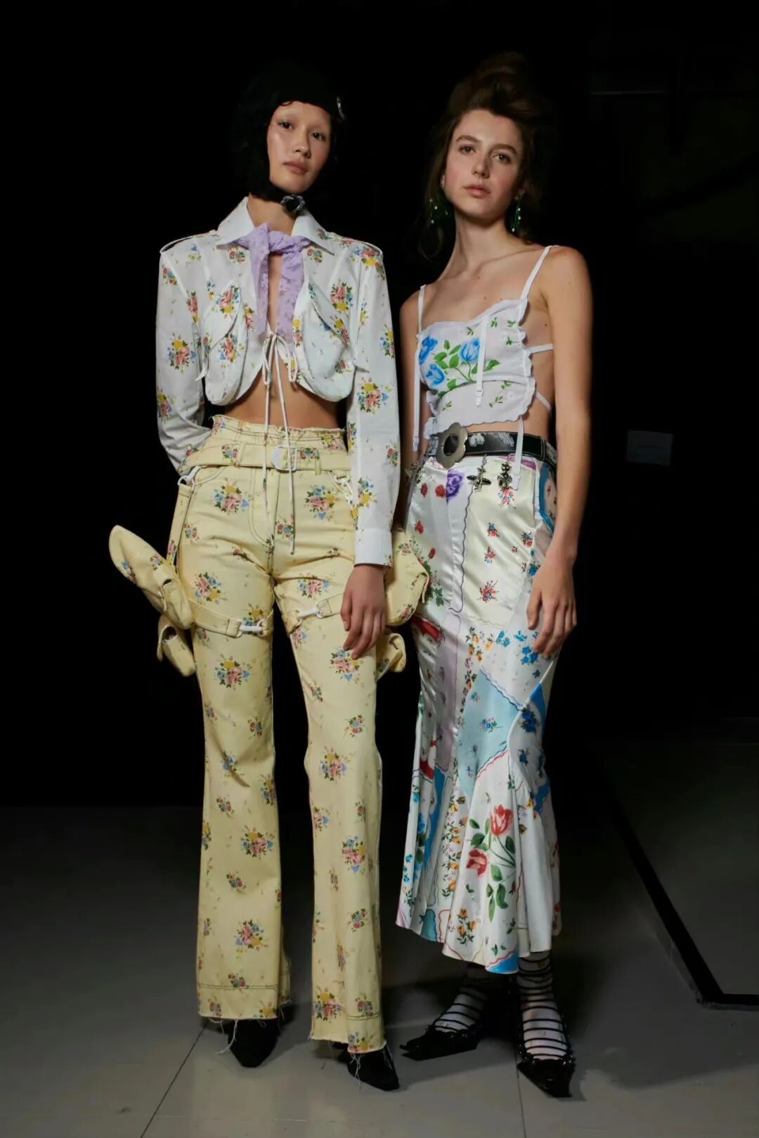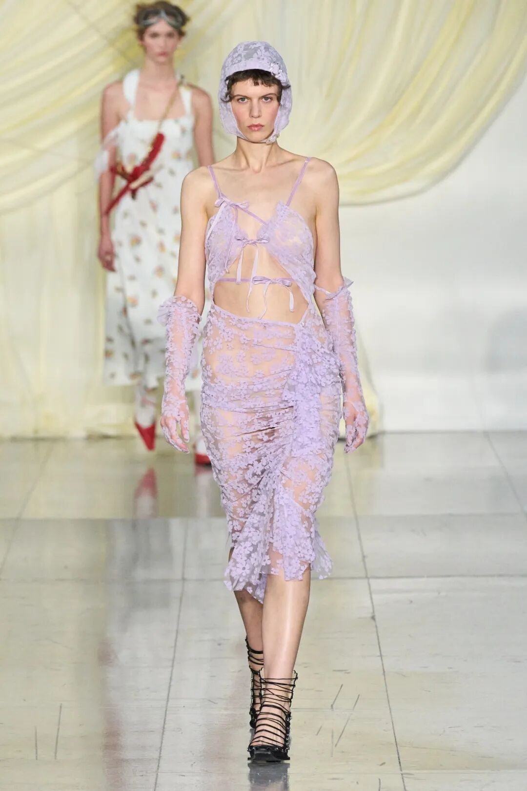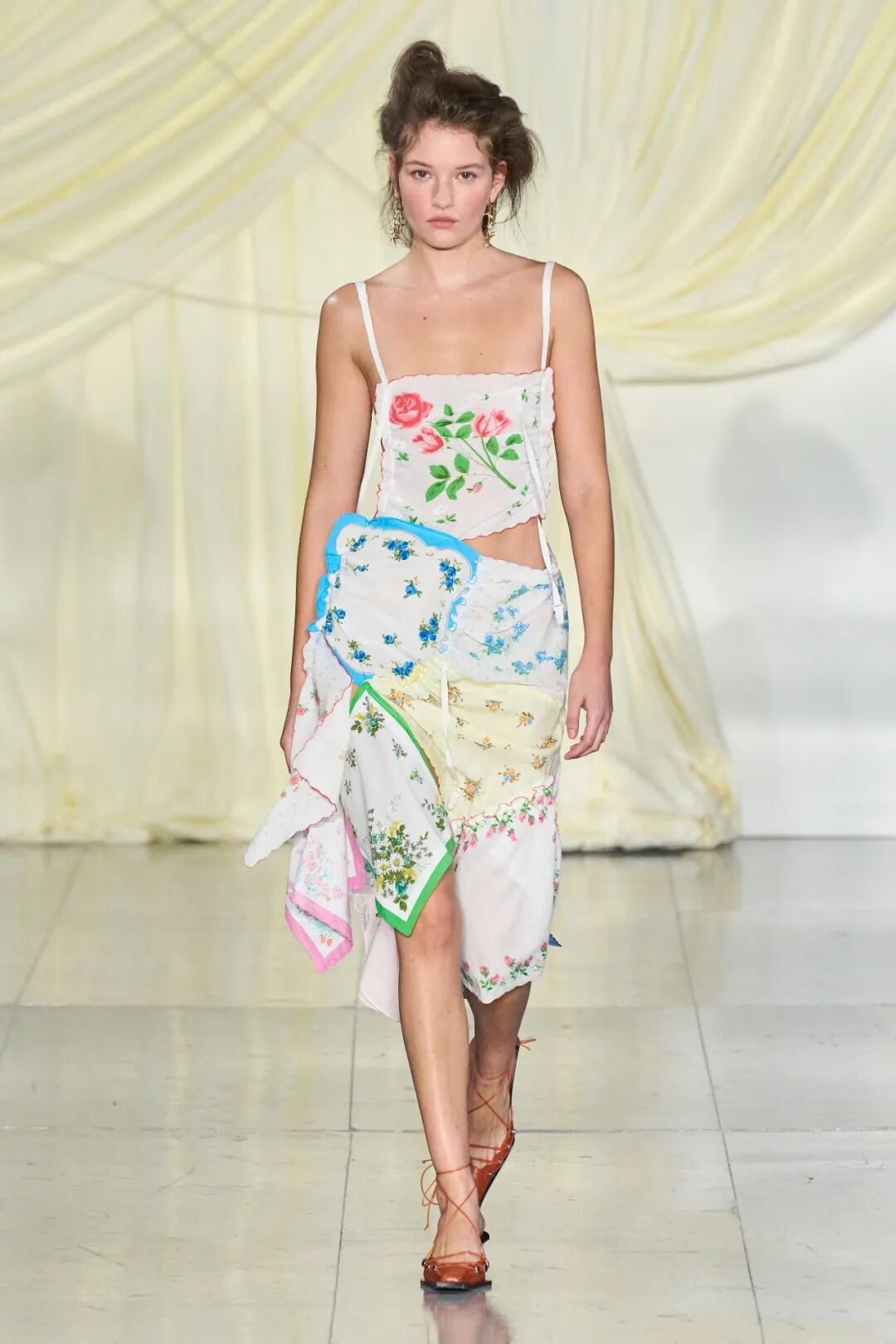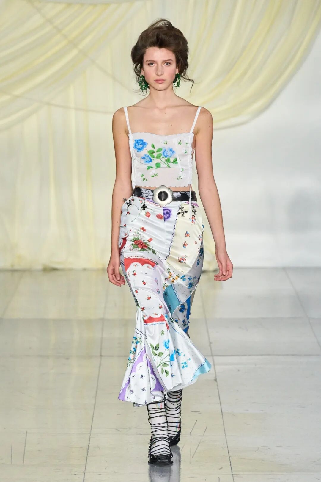 飞行员头盔般的头饰配以透视丝质面料,降落伞背包元素结合花卉印花连衣裙,以及在荷叶褶皱、印花拼接、维多利亚时代的束腰上衣中,引入一丝军事参考,Yuhan将两种截然不同的女性气质融合,在刚毅与柔美的碰撞中呈现出独属于Yuhan Wang的浪漫活力。