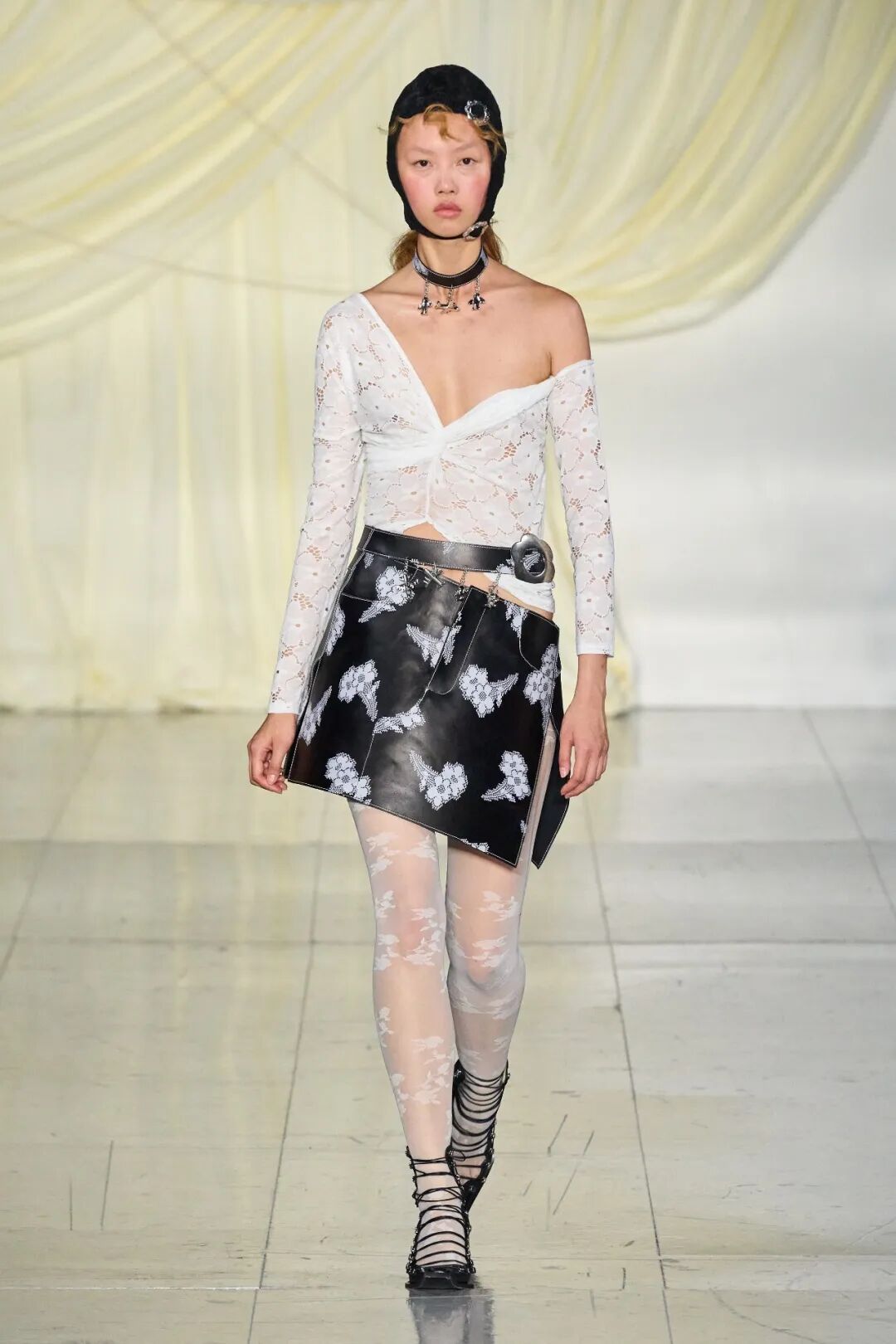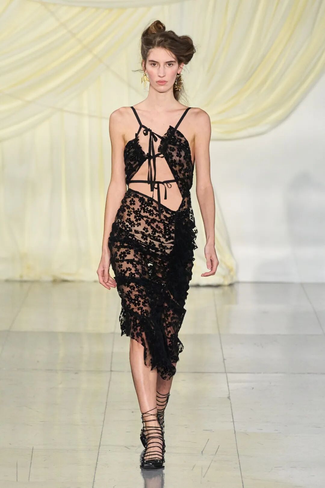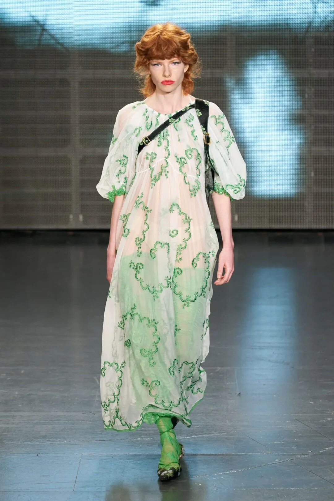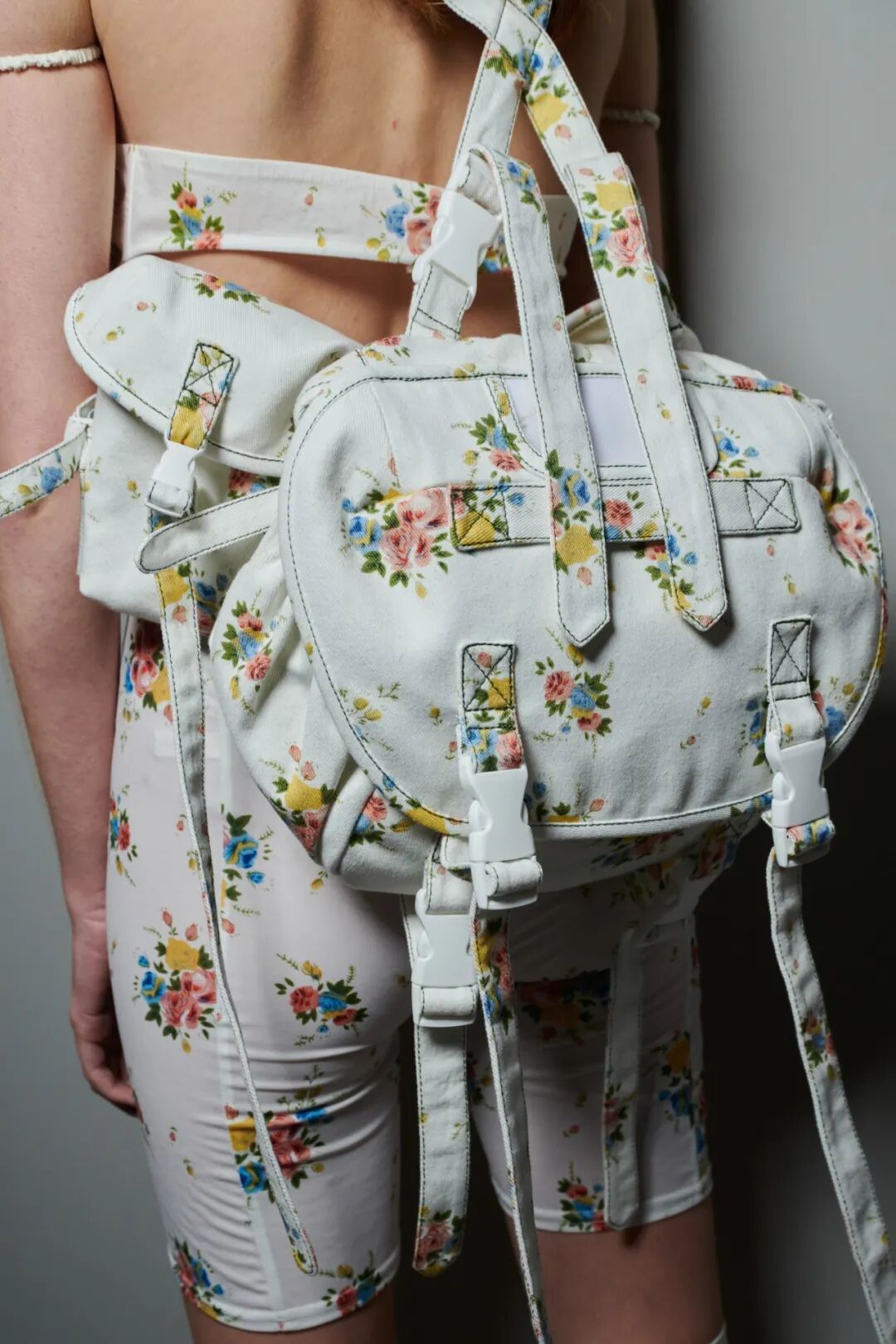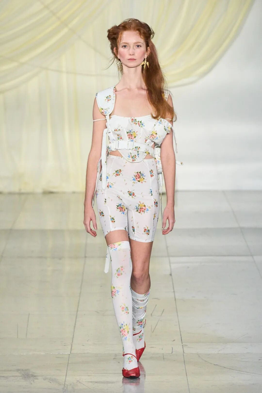 飞行员头盔般的头饰配以透视丝质面料,降落伞背包元素结合花卉印花连衣裙,以及在荷叶褶皱、印花拼接、维多利亚时代的束腰上衣中,引入一丝军事参考,Yuhan将两种截然不同的女性气质融合,在刚毅与柔美的碰撞中呈现出独属于Yuhan Wang的浪漫活力。