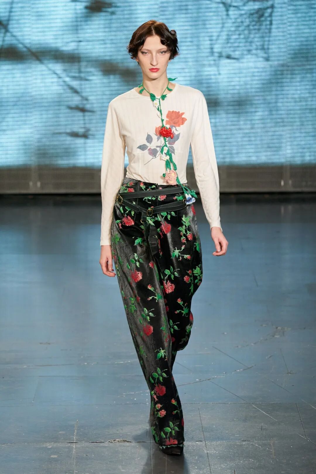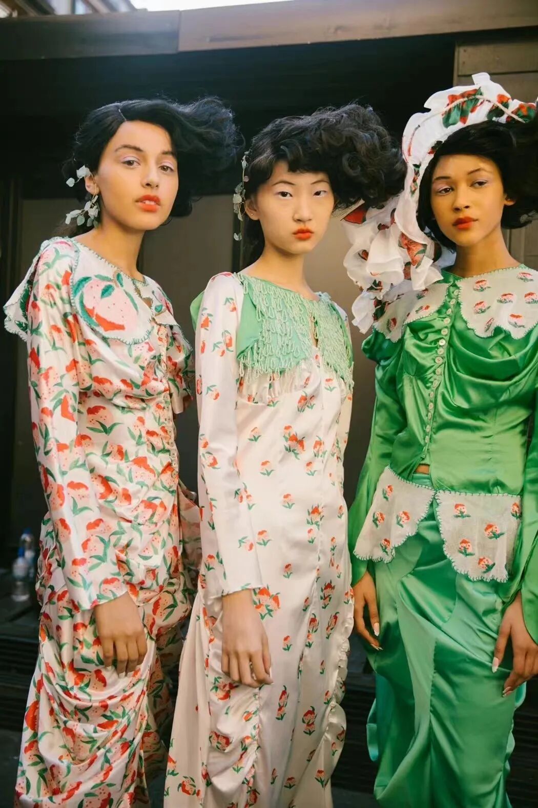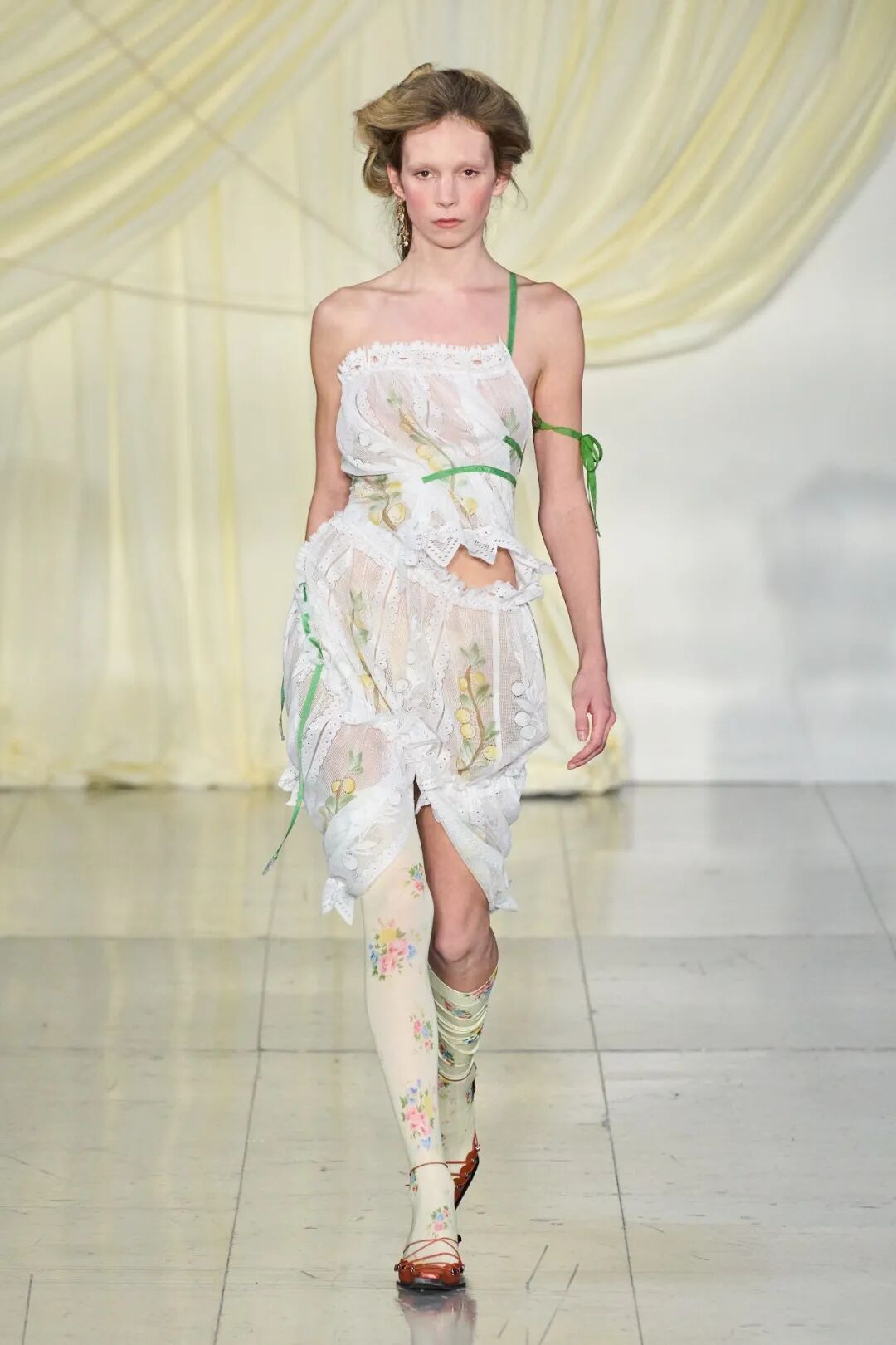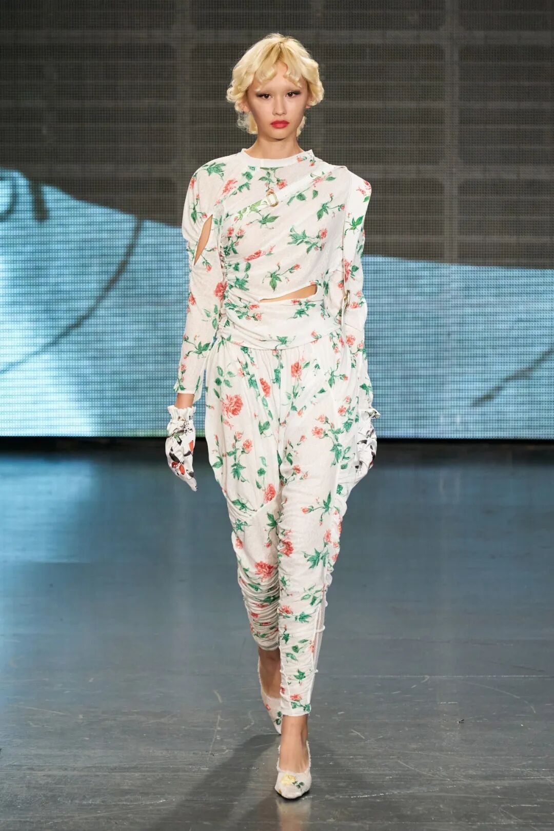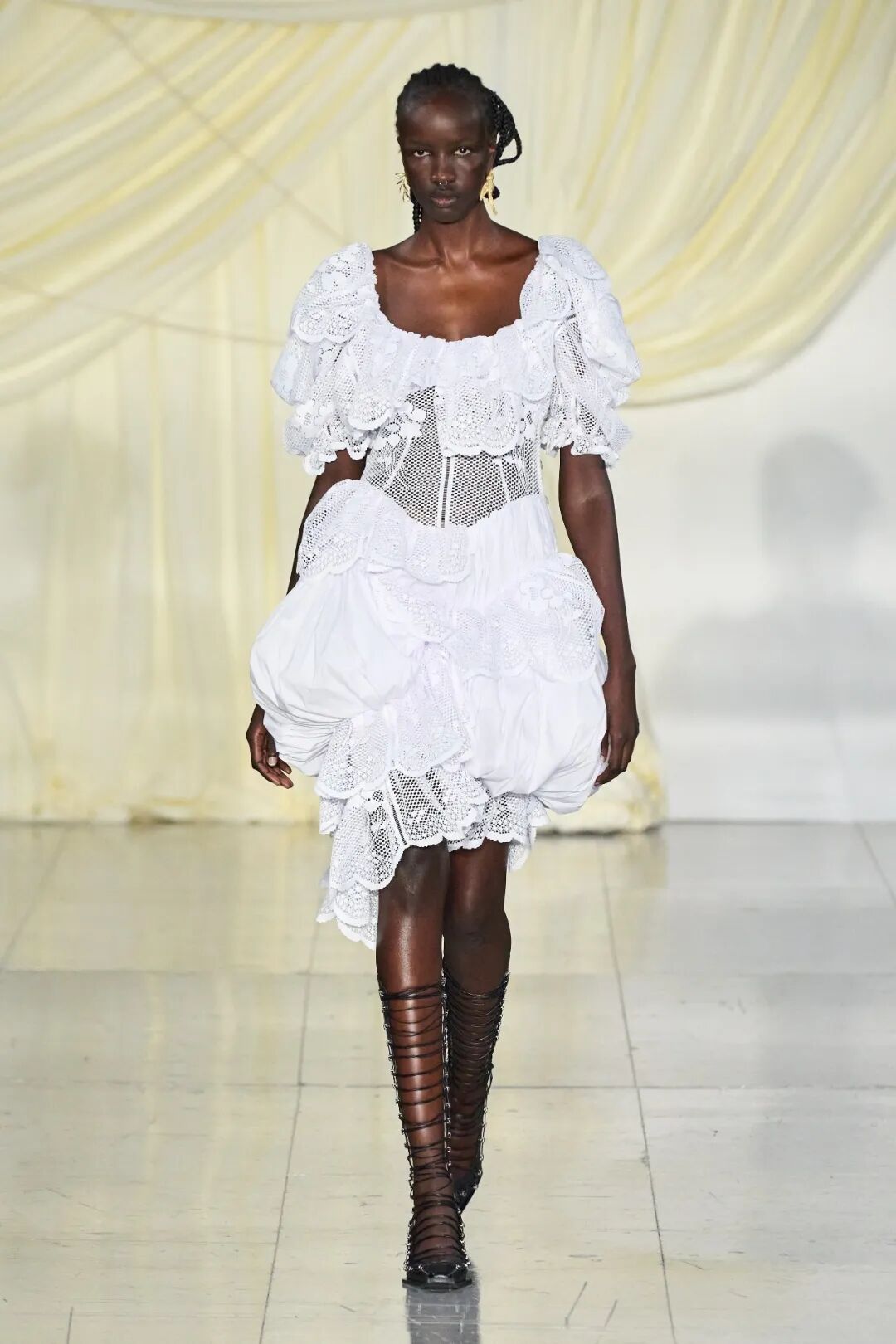 飞行员头盔般的头饰配以透视丝质面料,降落伞背包元素结合花卉印花连衣裙,以及在荷叶褶皱、印花拼接、维多利亚时代的束腰上衣中,引入一丝军事参考,Yuhan将两种截然不同的女性气质融合,在刚毅与柔美的碰撞中呈现出独属于Yuhan Wang的浪漫活力。
