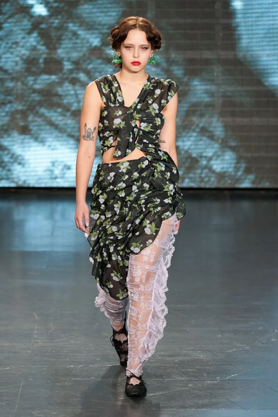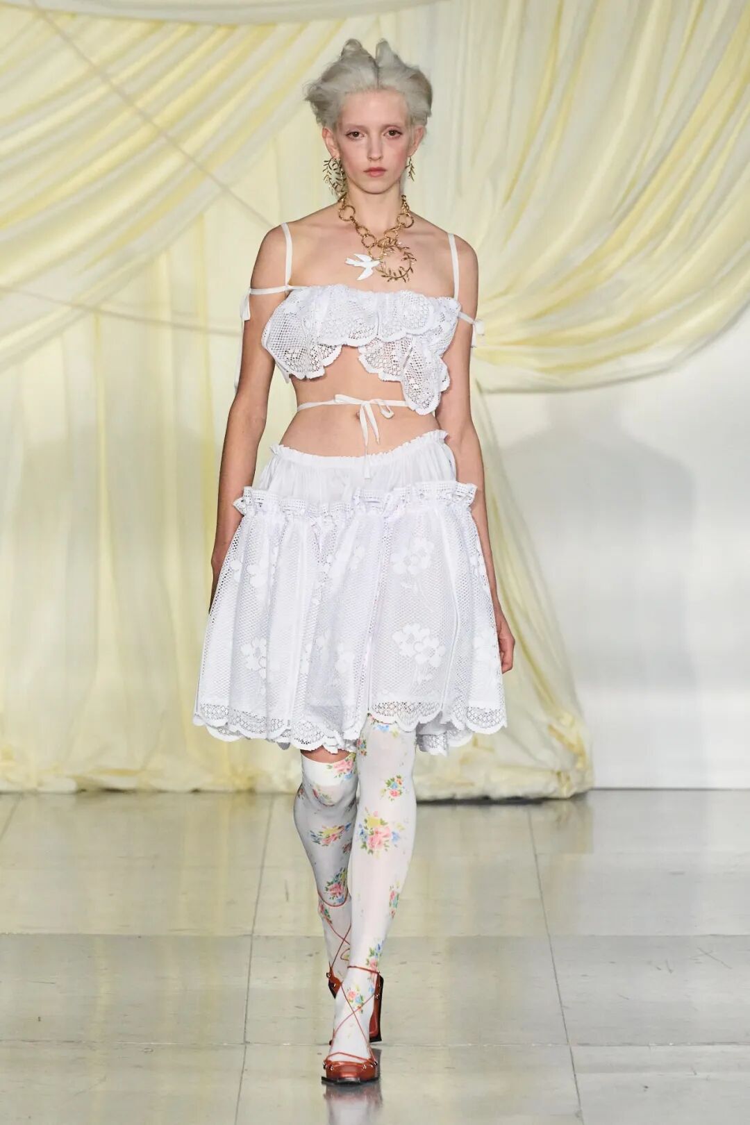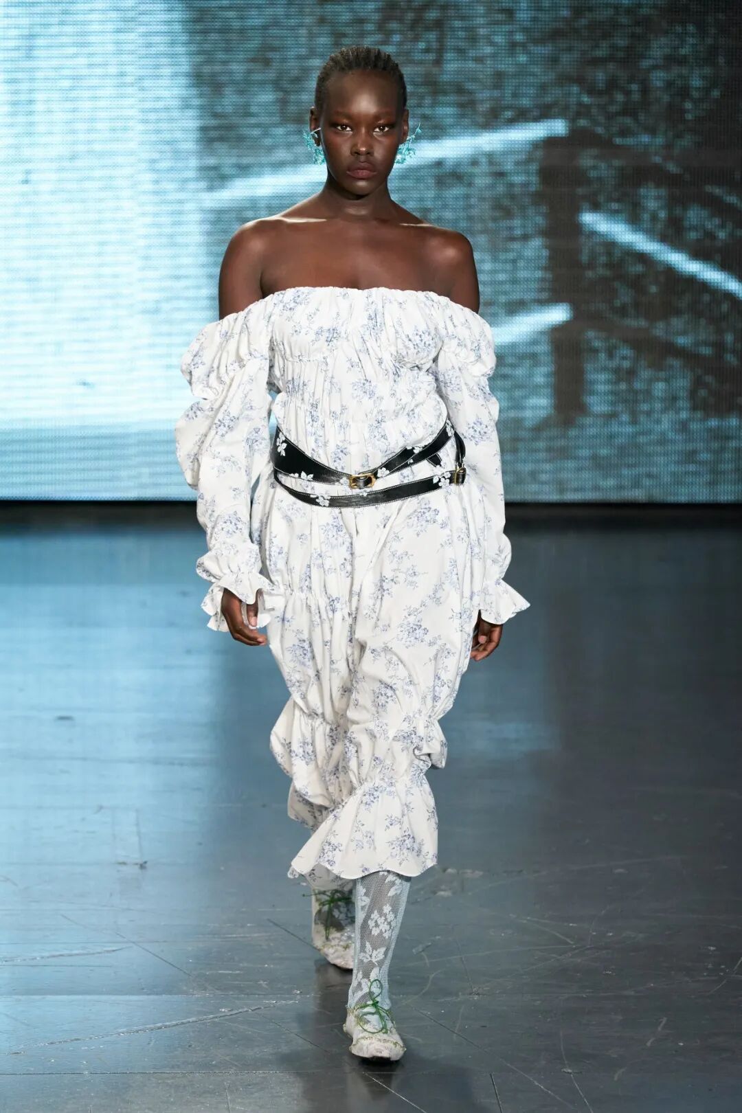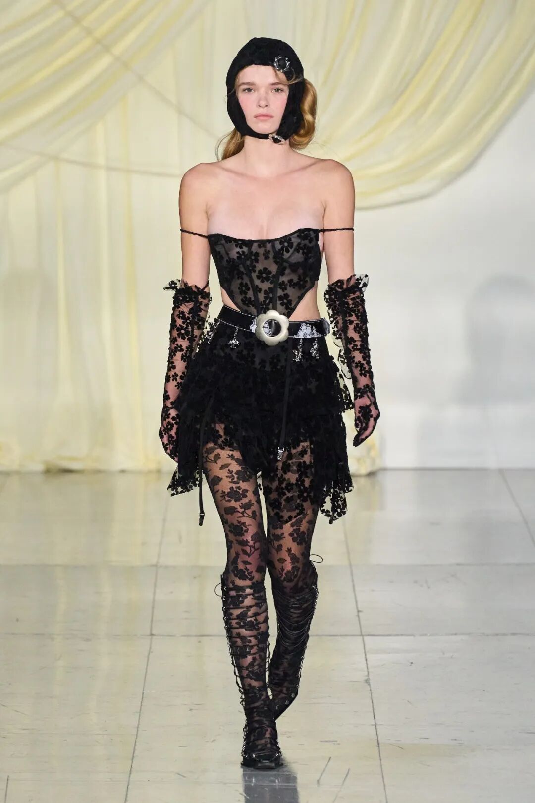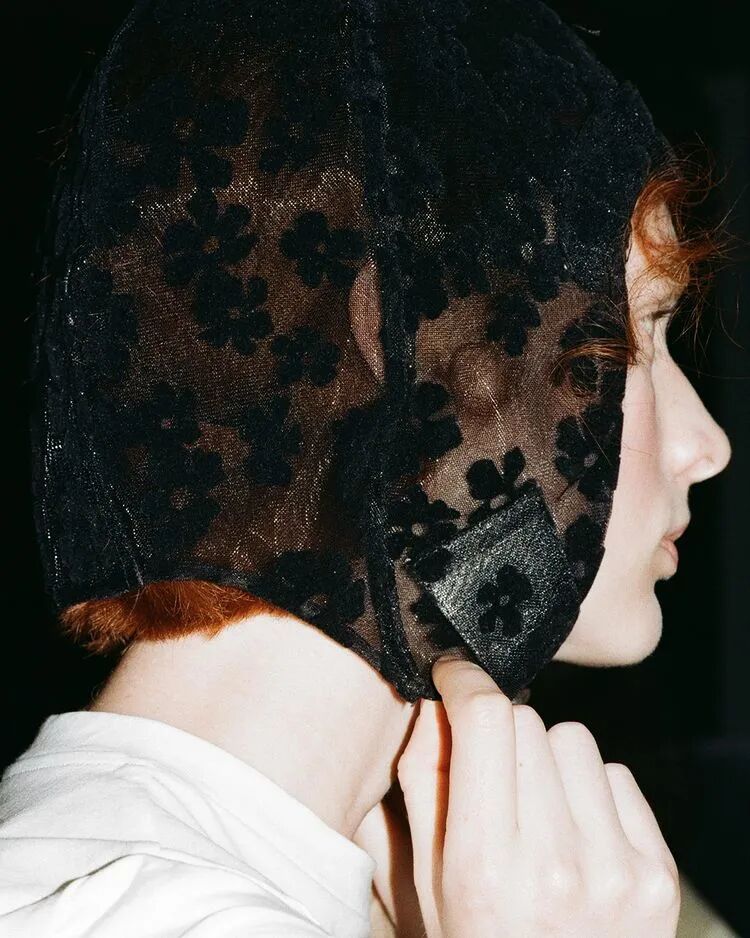 飞行员头盔般的头饰配以透视丝质面料,降落伞背包元素结合花卉印花连衣裙,以及在荷叶褶皱、印花拼接、维多利亚时代的束腰上衣中,引入一丝军事参考,Yuhan将两种截然不同的女性气质融合,在刚毅与柔美的碰撞中呈现出独属于Yuhan Wang的浪漫活力。