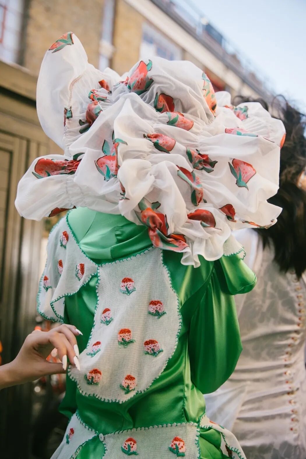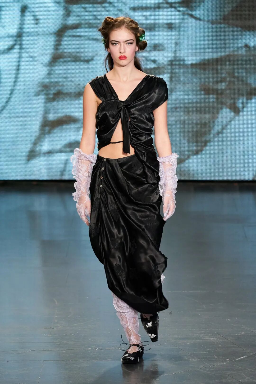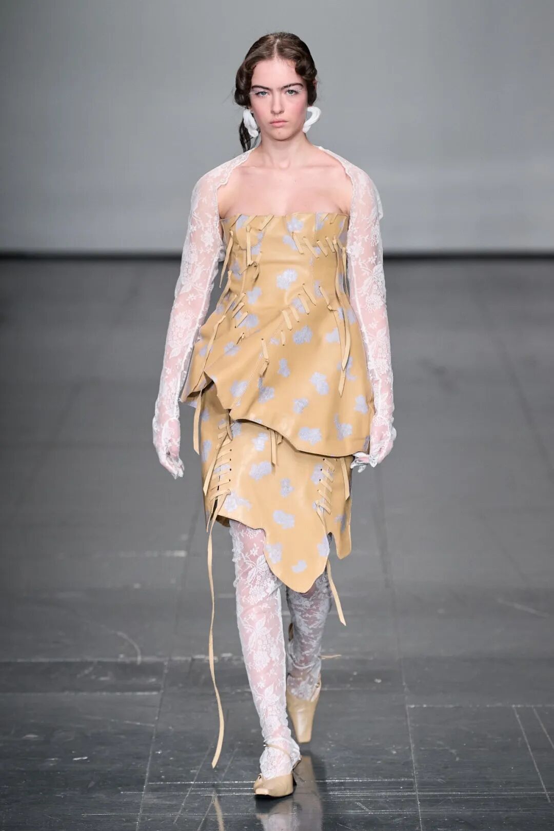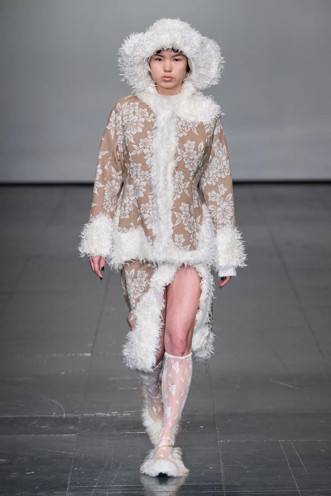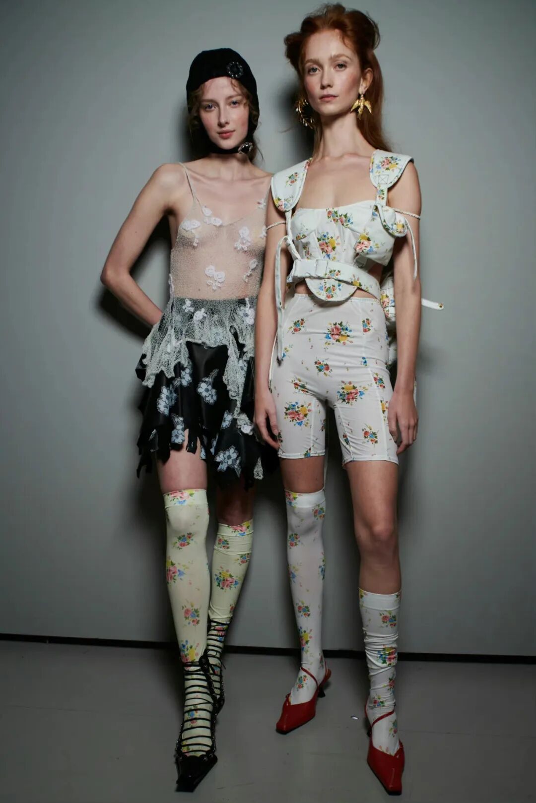 飞行员头盔般的头饰配以透视丝质面料,降落伞背包元素结合花卉印花连衣裙,以及在荷叶褶皱、印花拼接、维多利亚时代的束腰上衣中,引入一丝军事参考,Yuhan将两种截然不同的女性气质融合,在刚毅与柔美的碰撞中呈现出独属于Yuhan Wang的浪漫活力。
