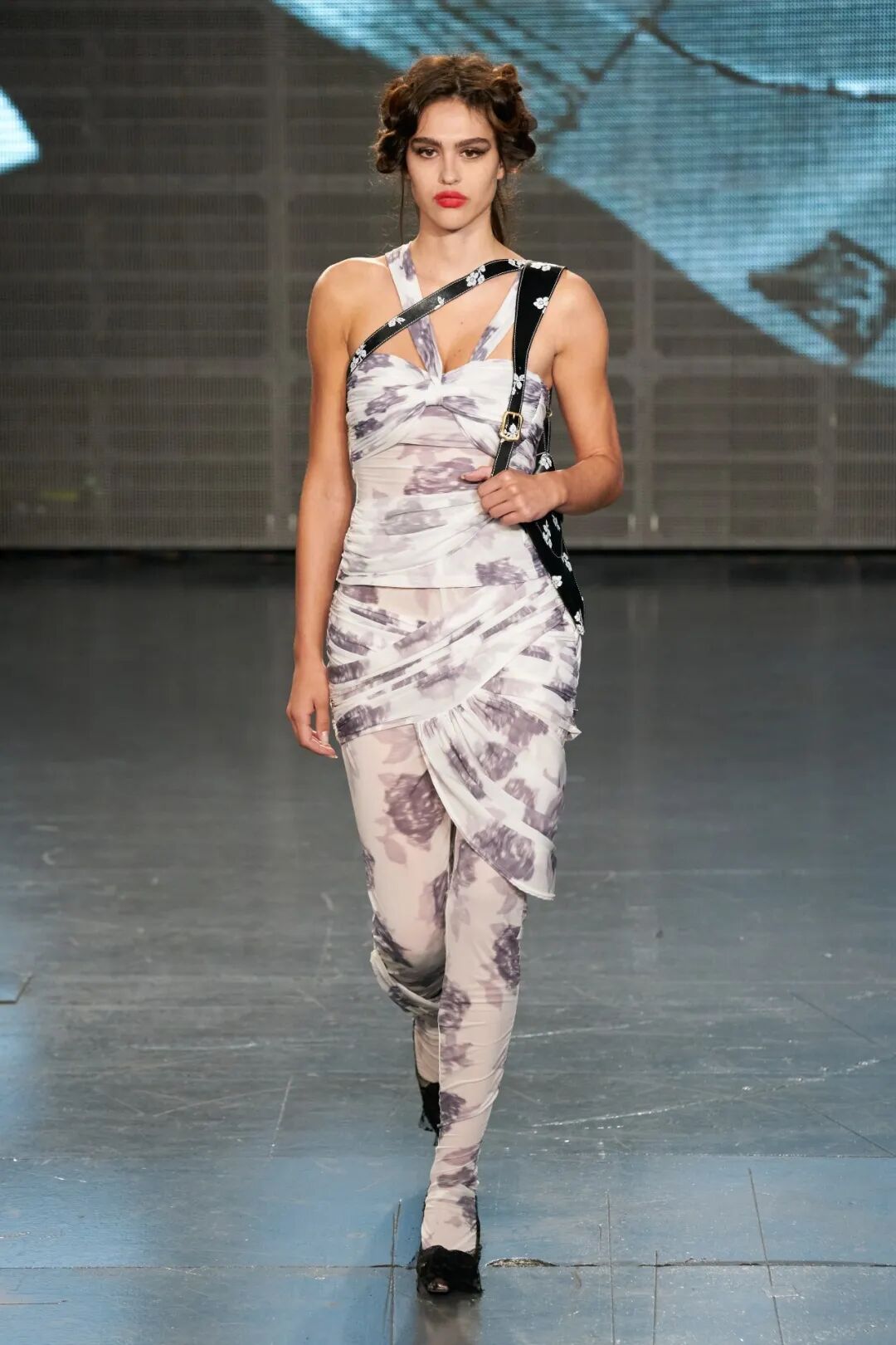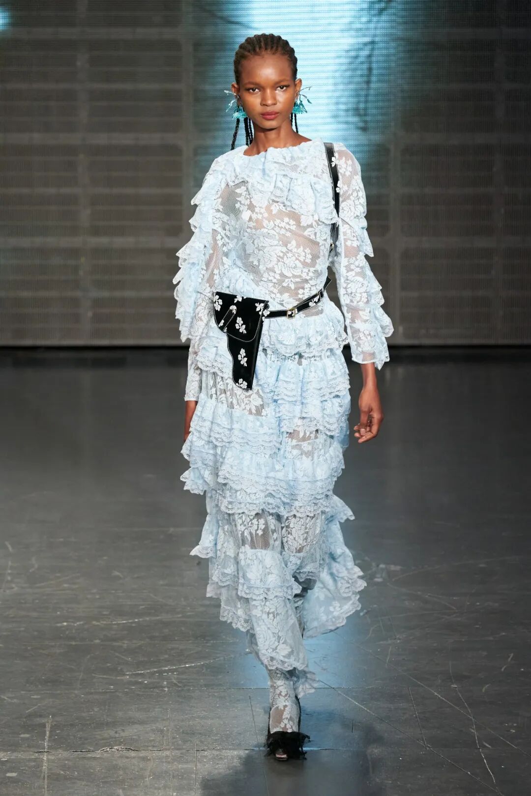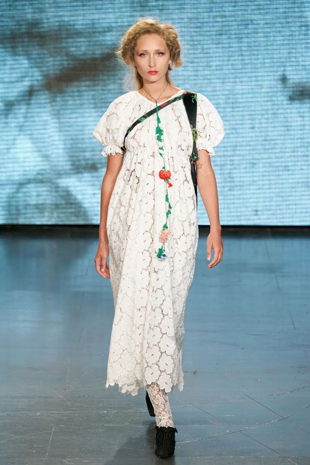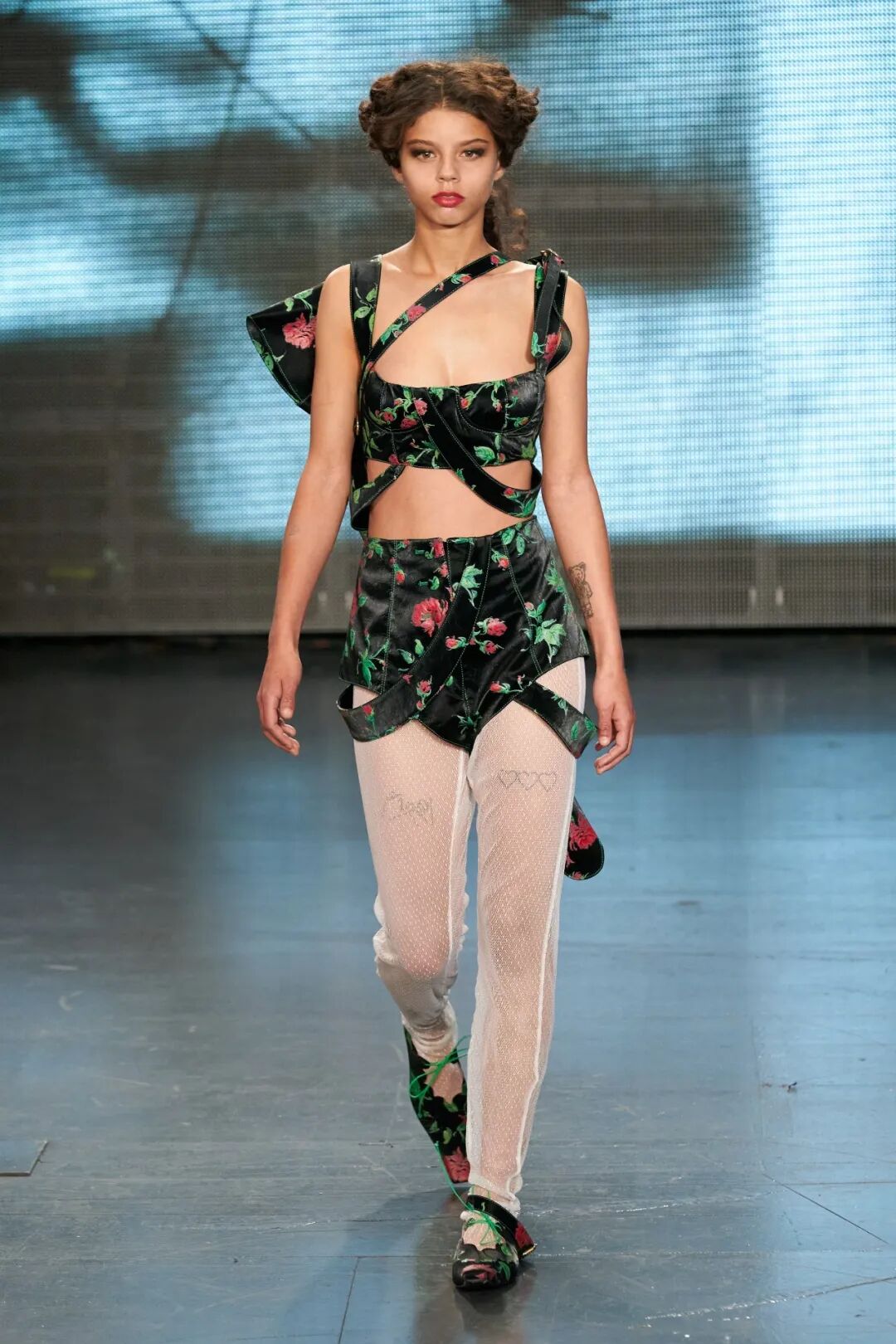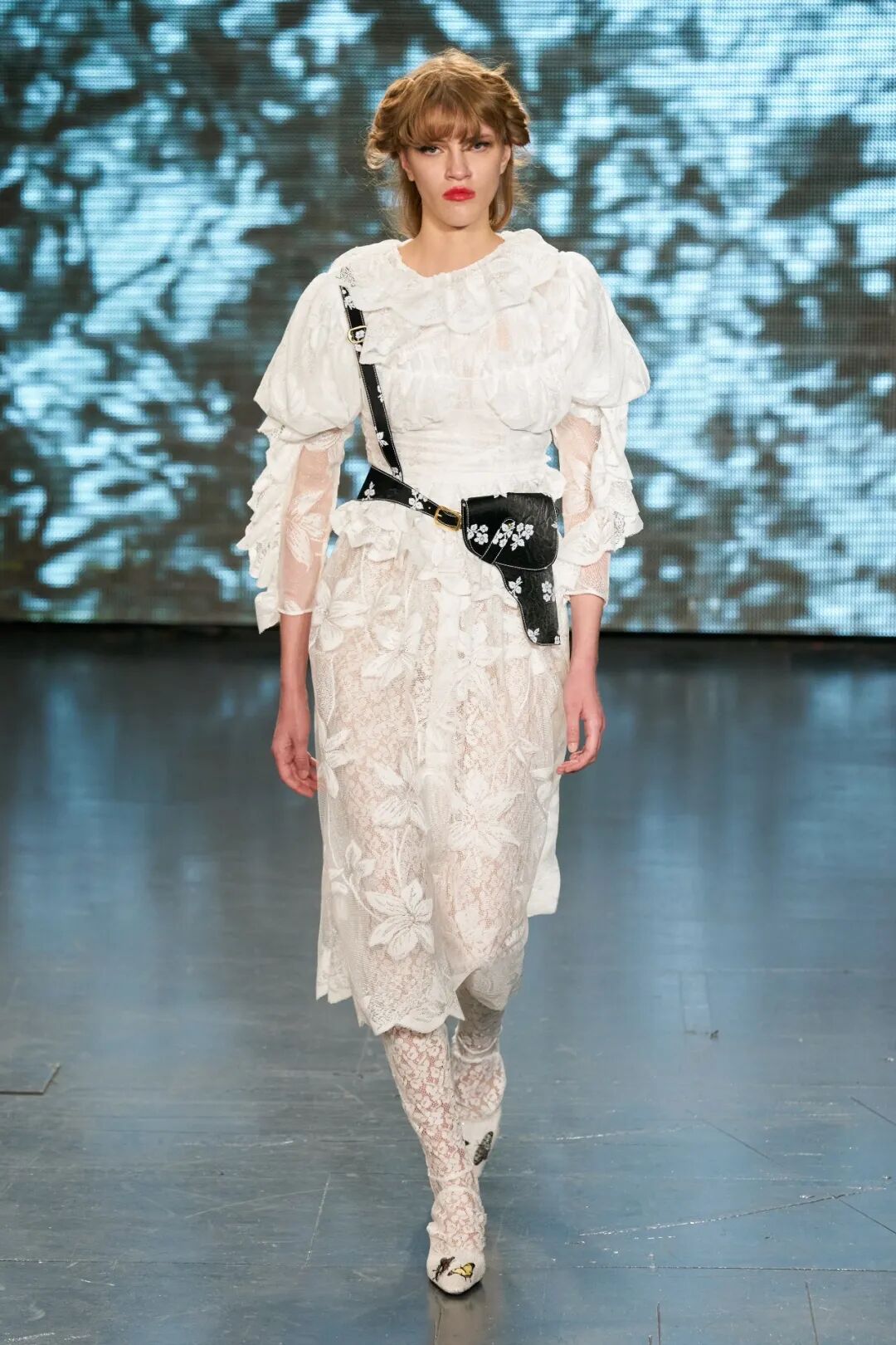 飞行员头盔般的头饰配以透视丝质面料,降落伞背包元素结合花卉印花连衣裙,以及在荷叶褶皱、印花拼接、维多利亚时代的束腰上衣中,引入一丝军事参考,Yuhan将两种截然不同的女性气质融合,在刚毅与柔美的碰撞中呈现出独属于Yuhan Wang的浪漫活力。