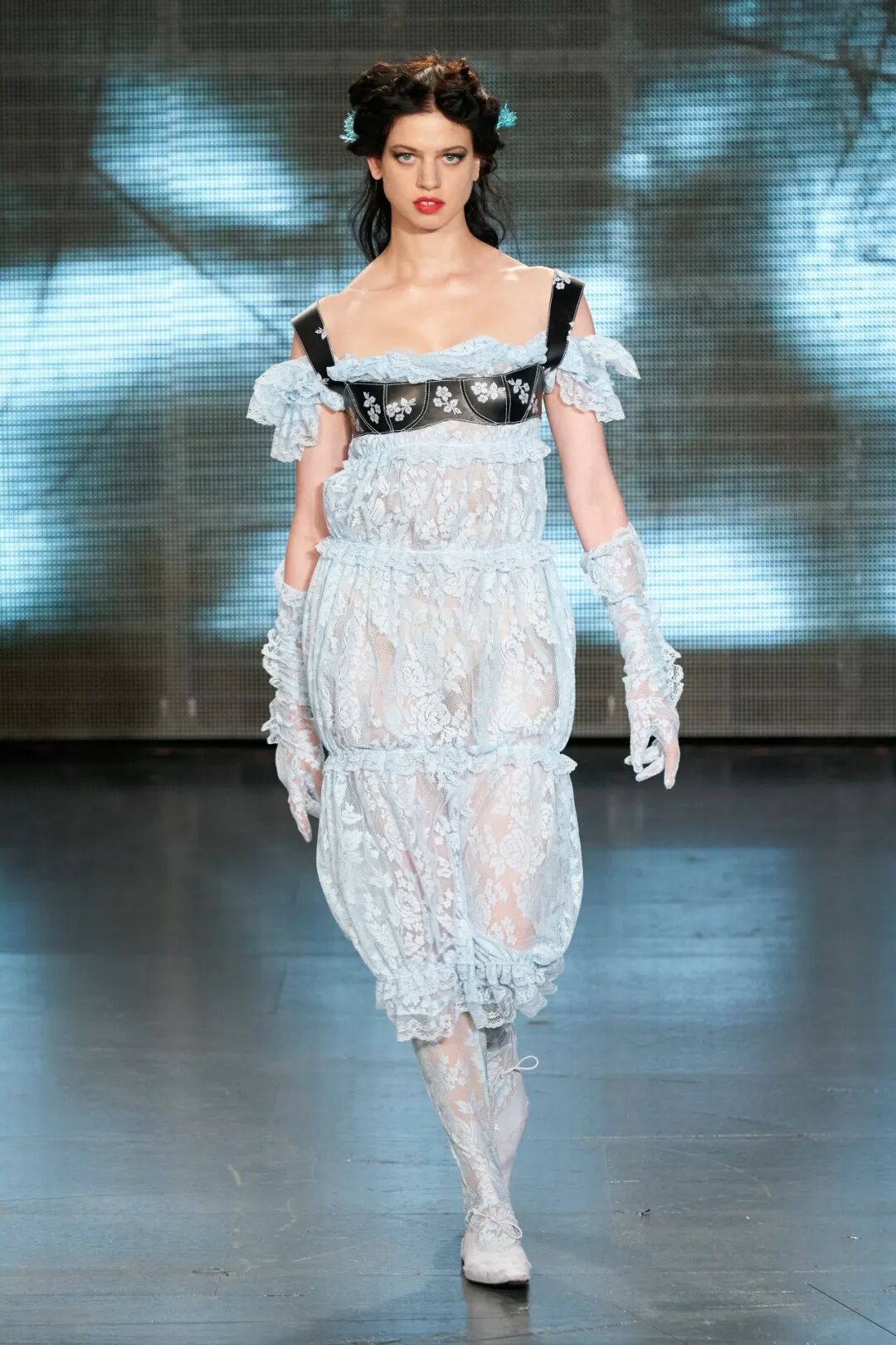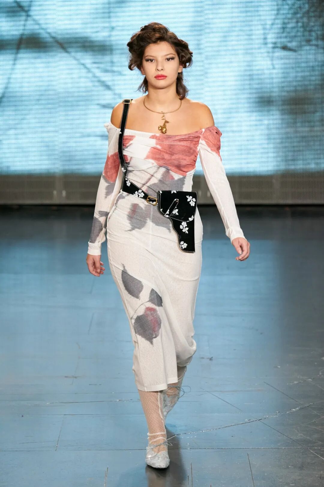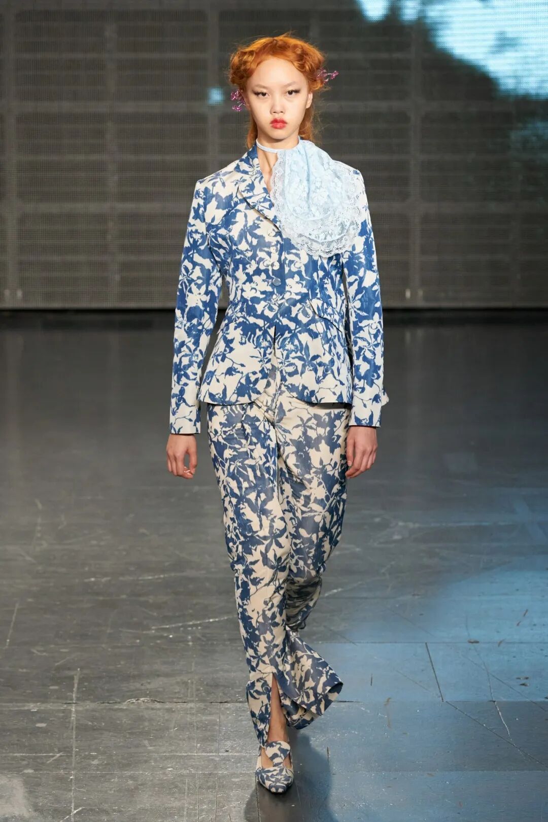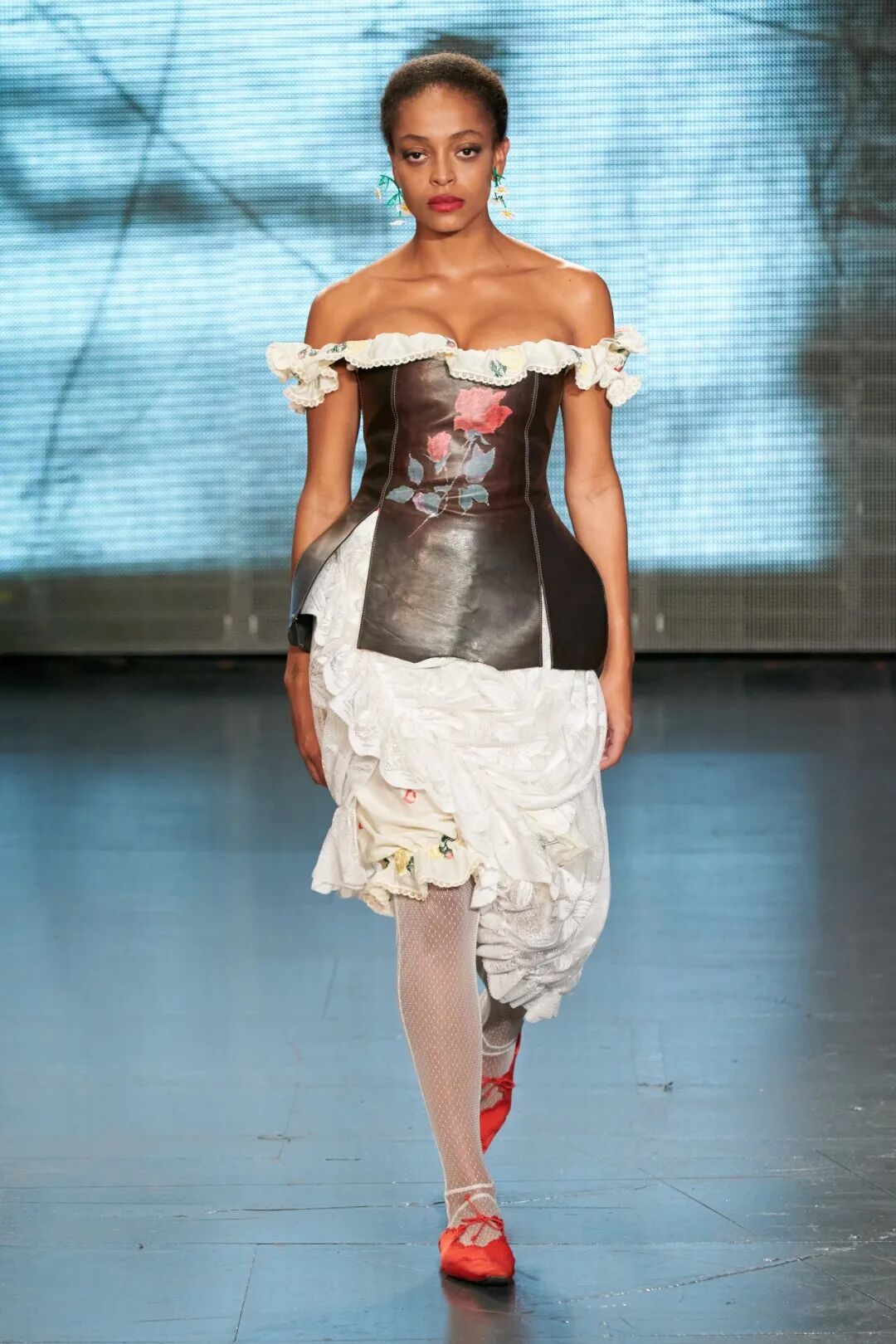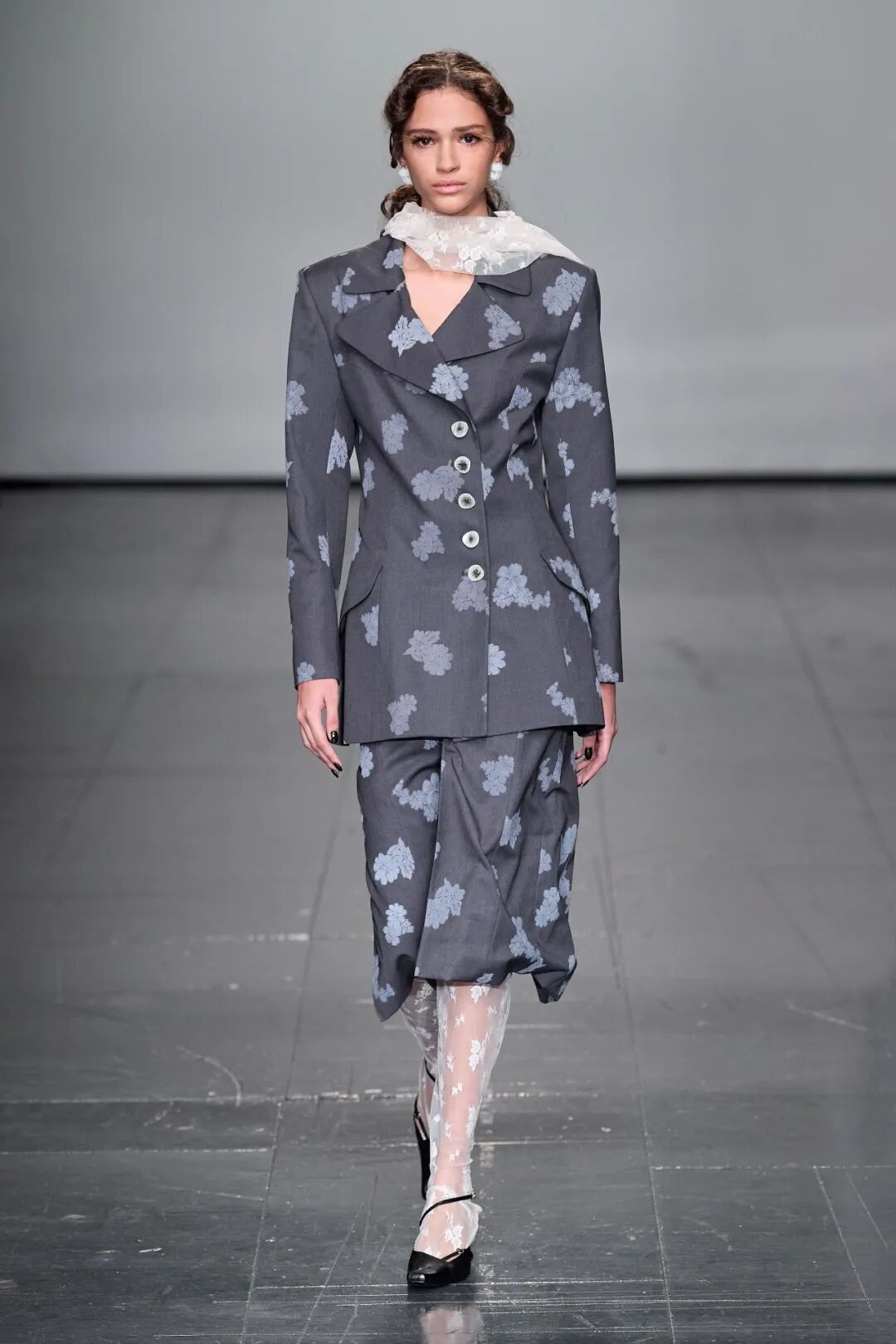 飞行员头盔般的头饰配以透视丝质面料,降落伞背包元素结合花卉印花连衣裙,以及在荷叶褶皱、印花拼接、维多利亚时代的束腰上衣中,引入一丝军事参考,Yuhan将两种截然不同的女性气质融合,在刚毅与柔美的碰撞中呈现出独属于Yuhan Wang的浪漫活力。