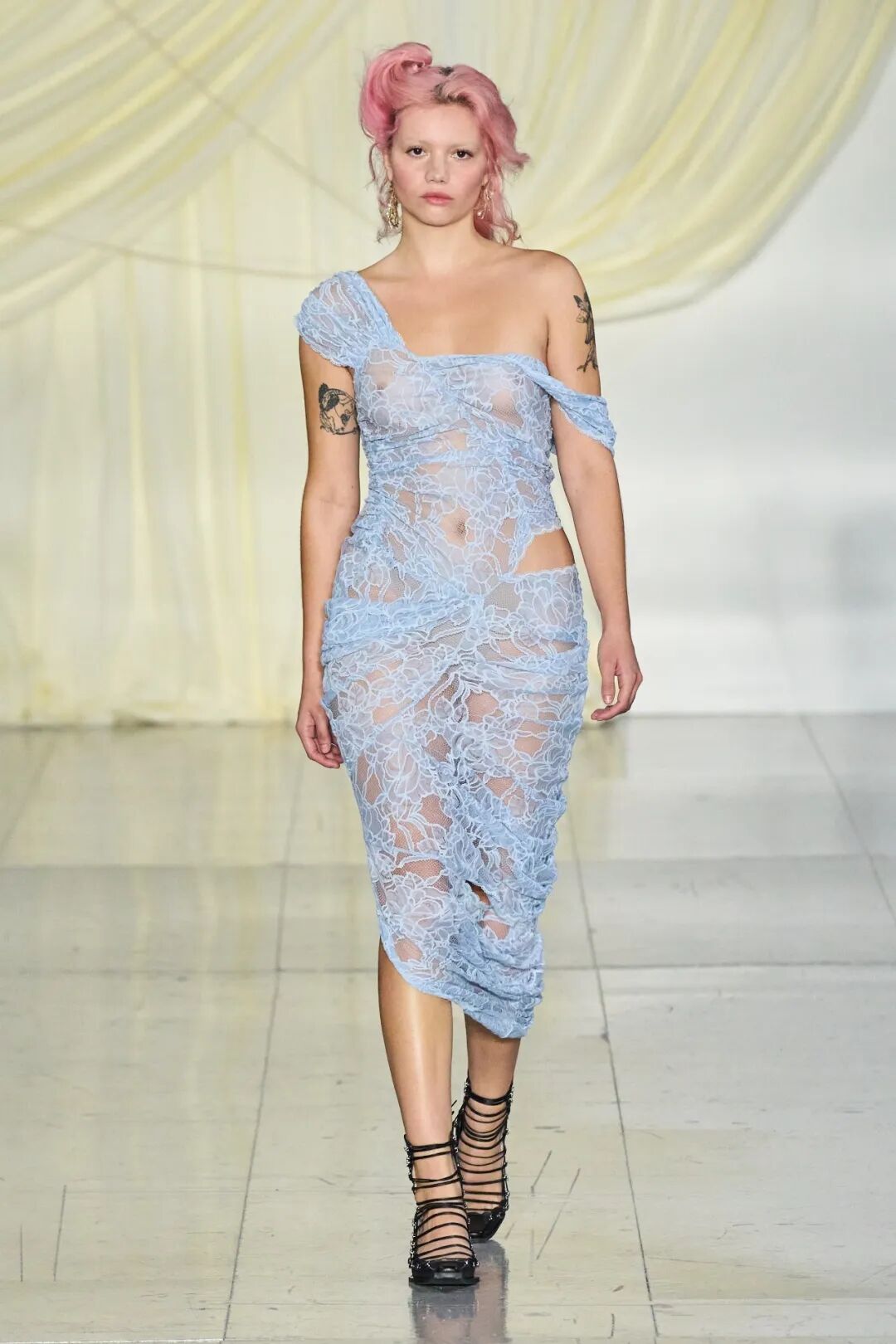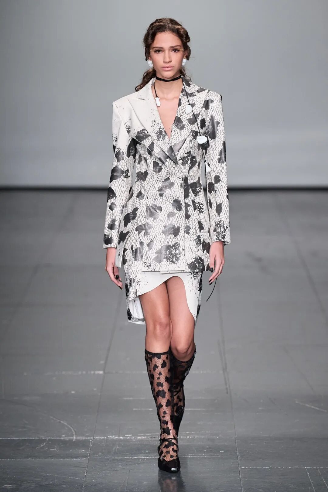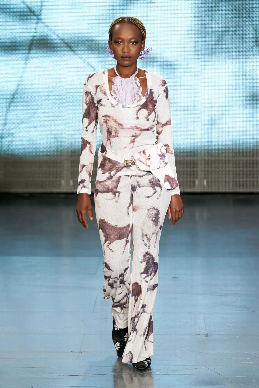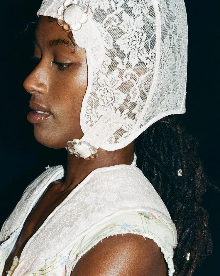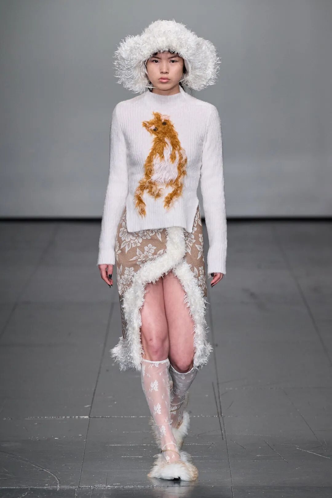 飞行员头盔般的头饰配以透视丝质面料,降落伞背包元素结合花卉印花连衣裙,以及在荷叶褶皱、印花拼接、维多利亚时代的束腰上衣中,引入一丝军事参考,Yuhan将两种截然不同的女性气质融合,在刚毅与柔美的碰撞中呈现出独属于Yuhan Wang的浪漫活力。
