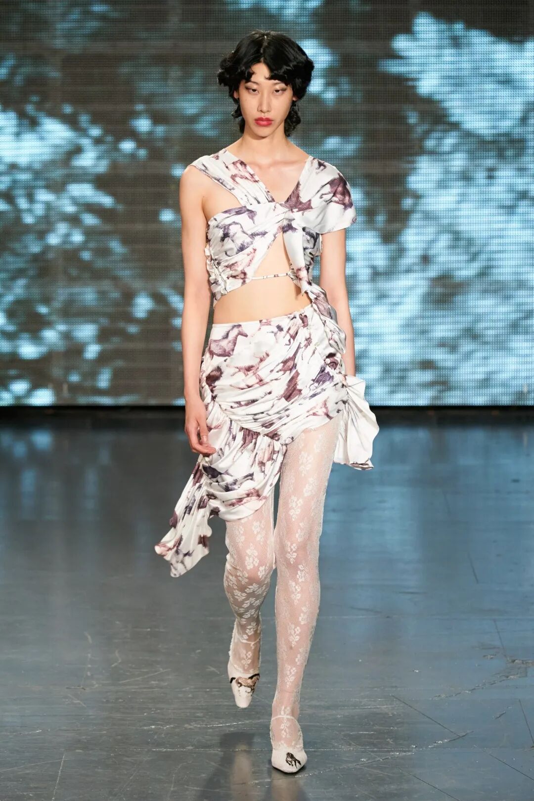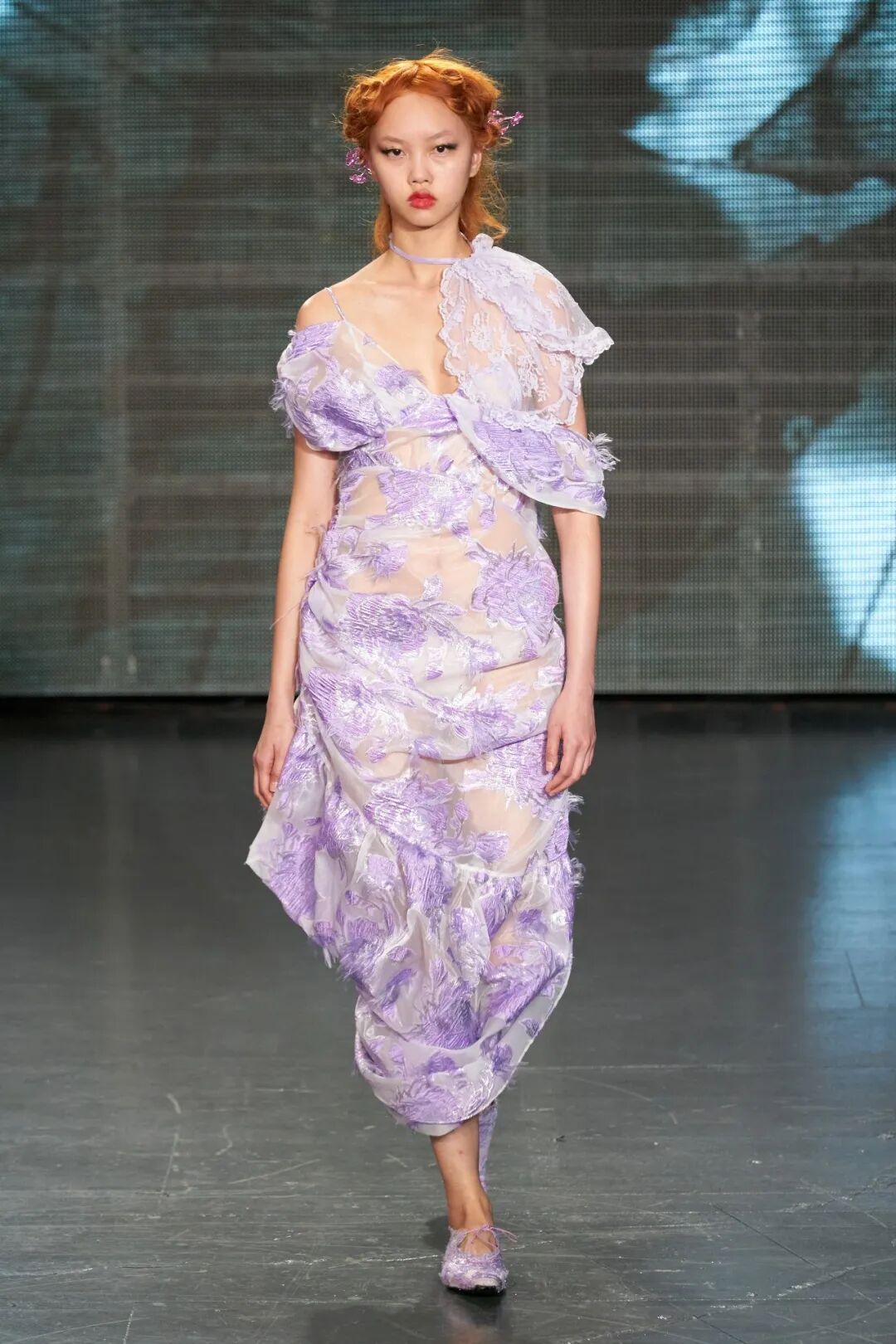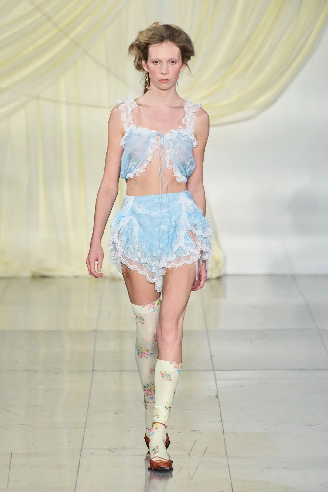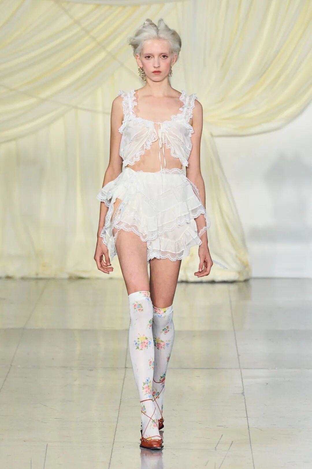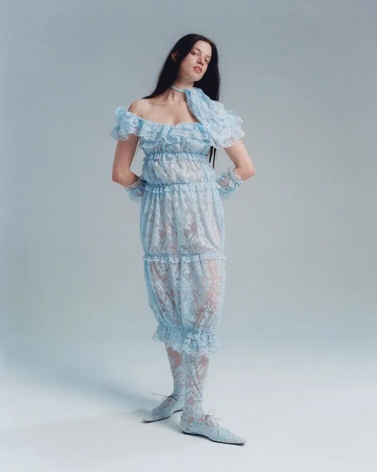 清新柔和的色调与丰富的花卉印花依附在褶饰轮廓之上,服装被巧妙地覆盖。蕾丝和丝绸是Yuhan Wang面料运用中的重头戏,比例和层叠被视为该品牌的标志性设计特征。