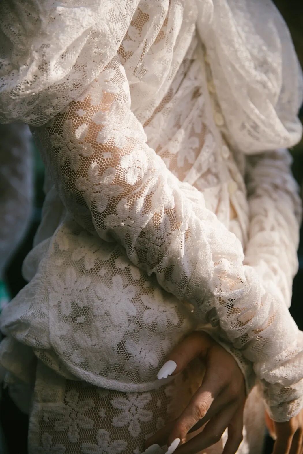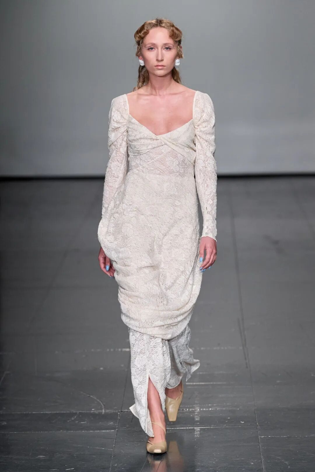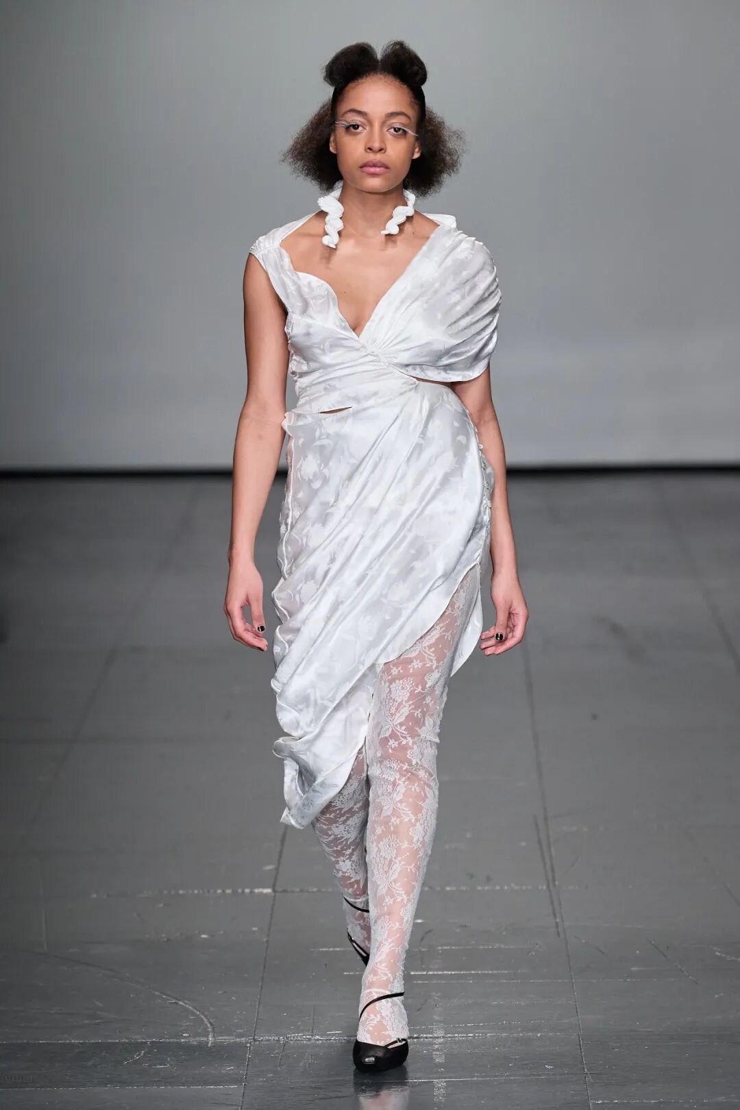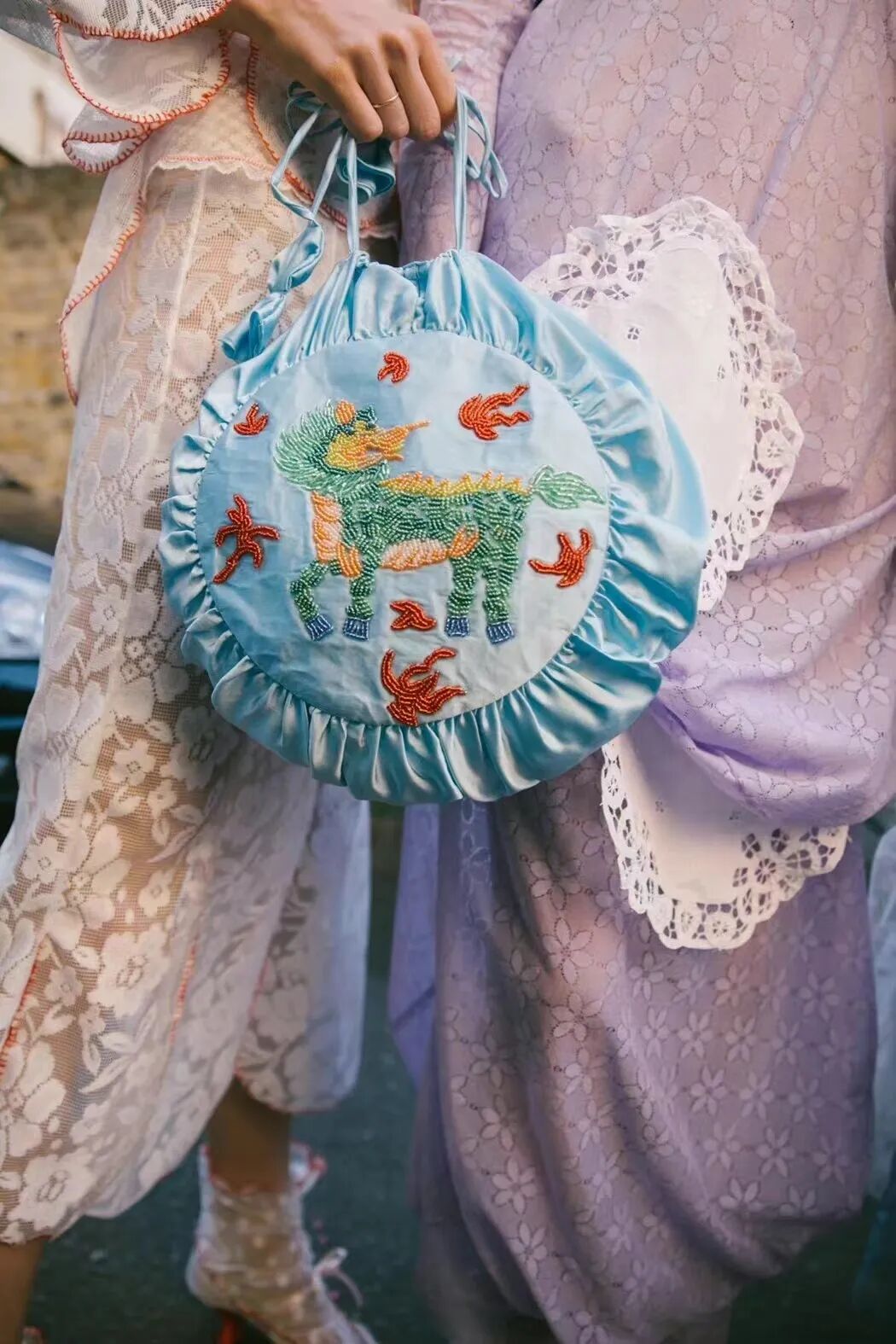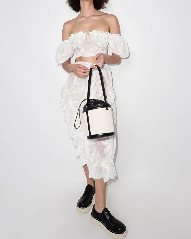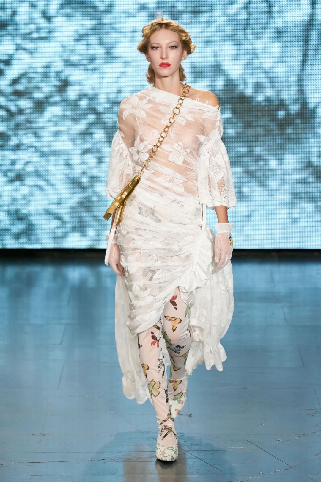 清新柔和的色调与丰富的花卉印花依附在褶饰轮廓之上,服装被巧妙地覆盖。蕾丝和丝绸是Yuhan Wang面料运用中的重头戏,比例和层叠被视为该品牌的标志性设计特征。