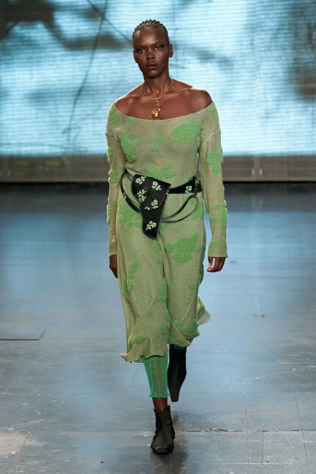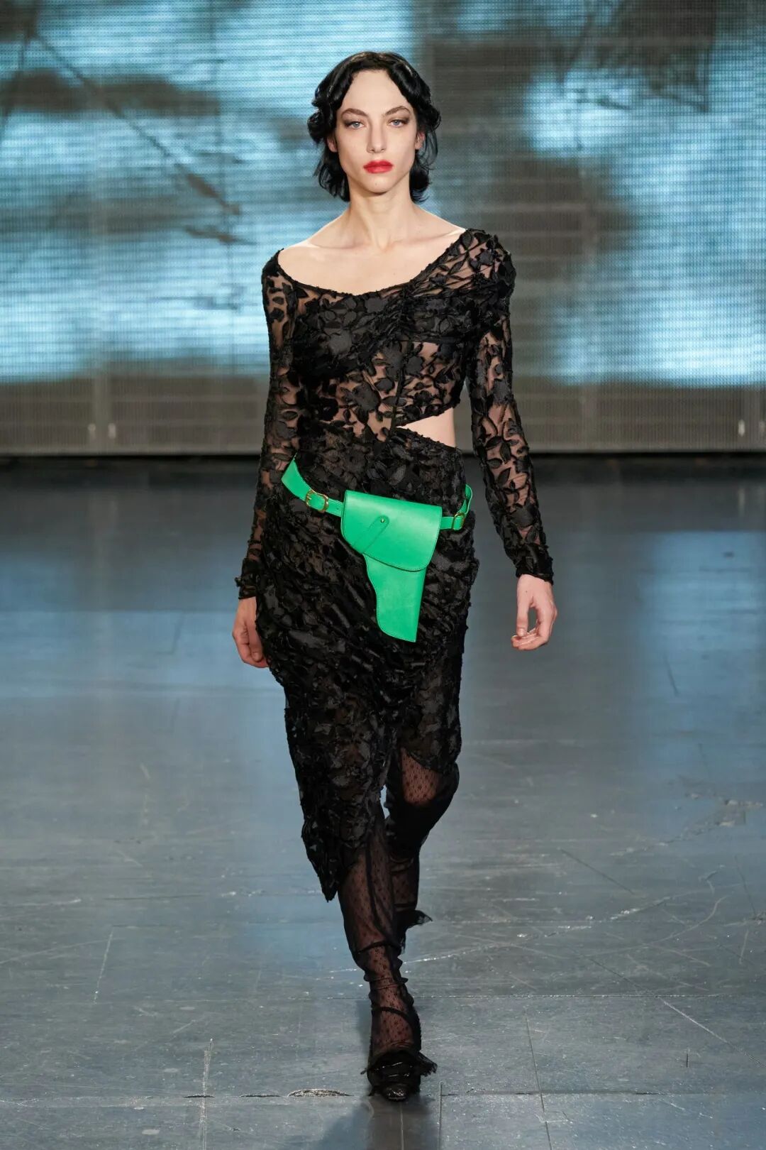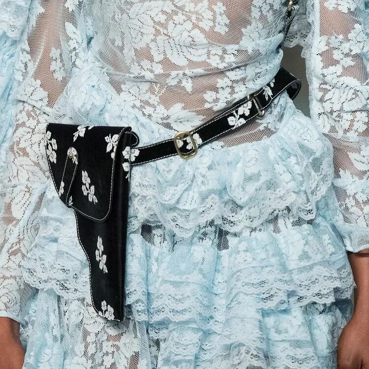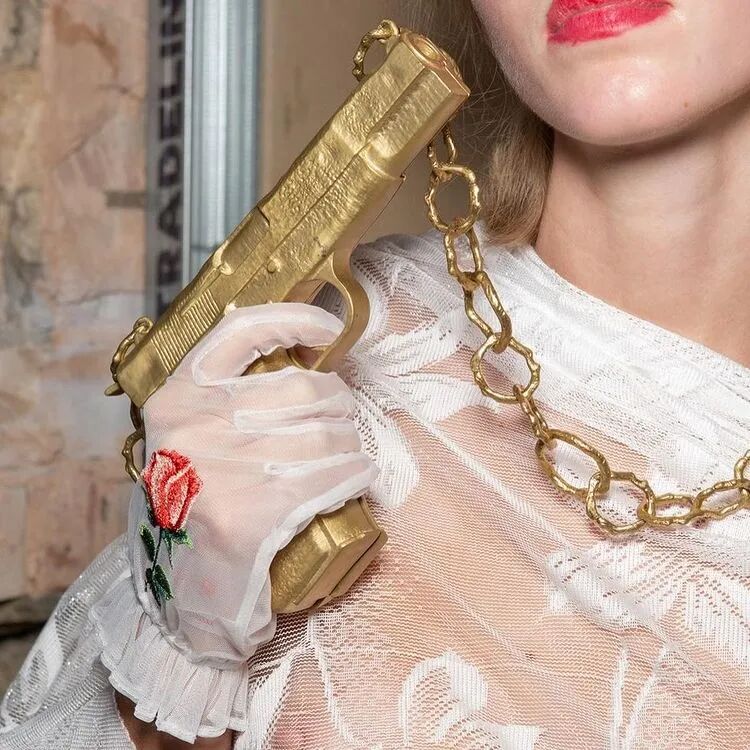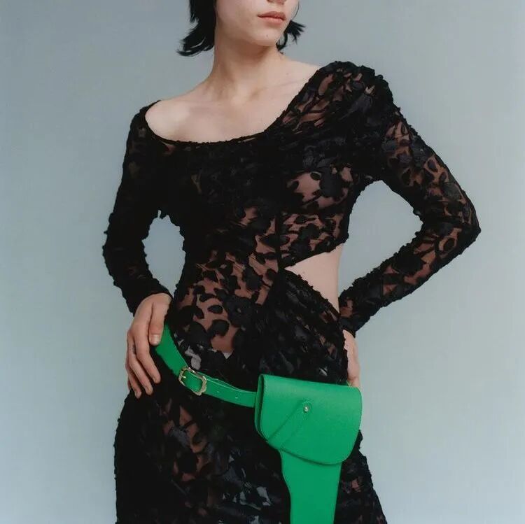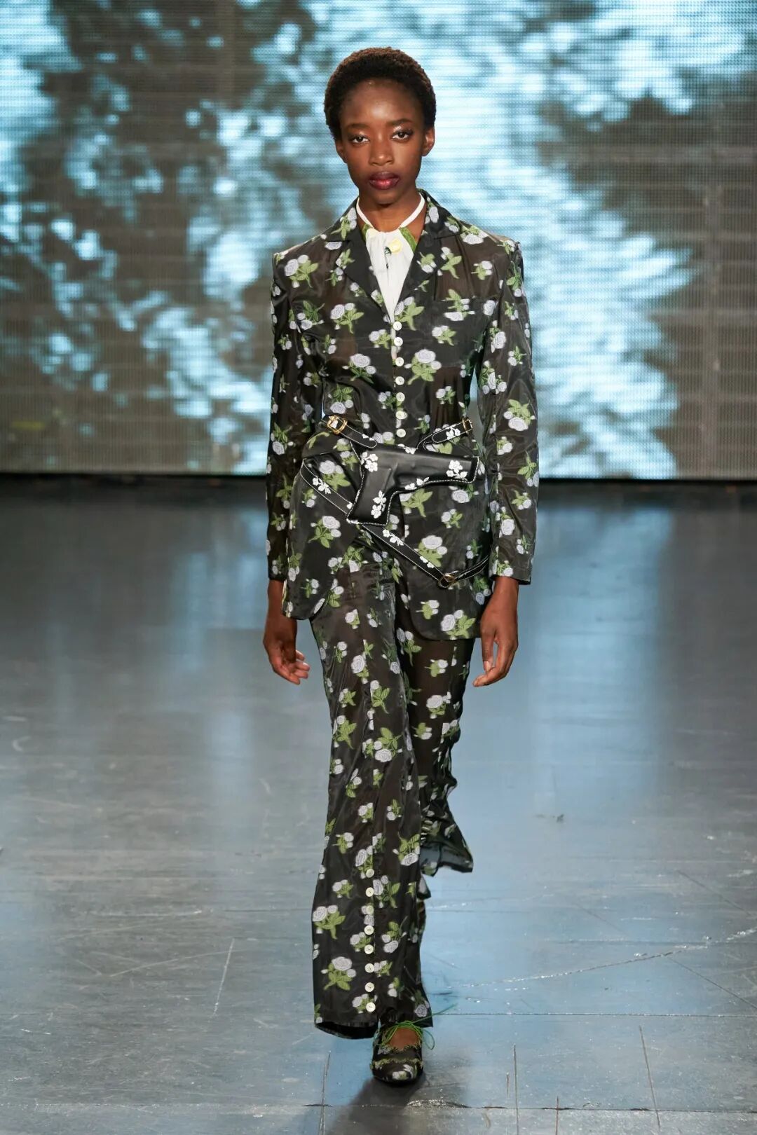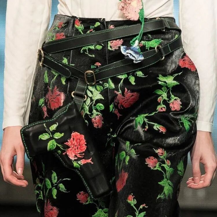 以表达对Sarah Everard等女性强暴案的悲伤和愤怒为源动力,Yuhan Wang创作了这一名为《配枪朱丽叶》的系列。与以往所展示的诗意浪漫有所微妙的不同,Yuhan在本季象征性地武装了她的女性形象,如在绿色花卉印花套装下,隐藏的是绿色花卉印花的手枪皮套。
