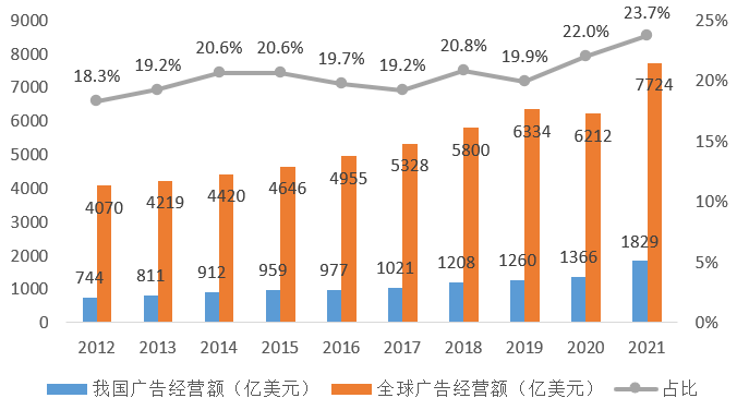 图2 2012-2021年我国广告经营额在全球市场的比重变化[4]
