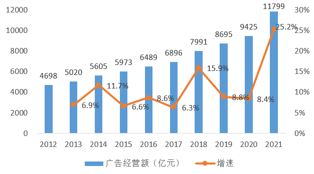 数据显示,2012年,全国广告经营额约为4698亿元[1]。而在2021年,全国广告业事业单位和规模以上企业的广告业务收入首次突破1万亿元,达到11799亿元[2],10年间增幅超过2.5倍(见图1)。