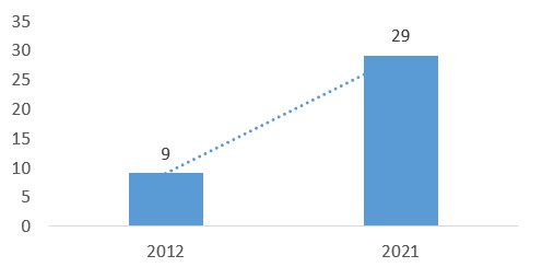 图4 2012和2021年国家广告产业园区数量变化
