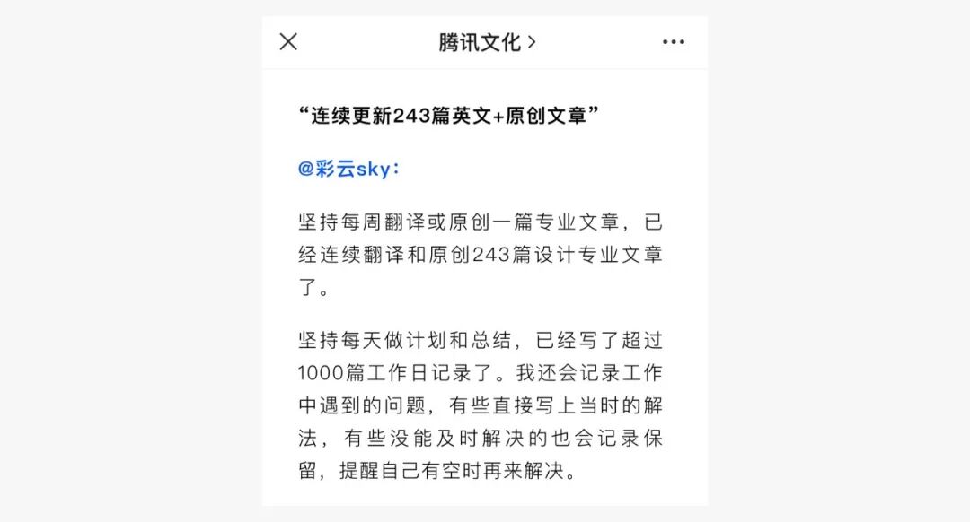 2)在腾讯文化官方公众号上获得推荐。腾讯文化希望我能作为员工UGC话题”时间的朋友们“中的优秀代表,分享鹅民们长期坚持的好习惯和心得。文章原文请见:《和时间做朋友的腾讯人》。
