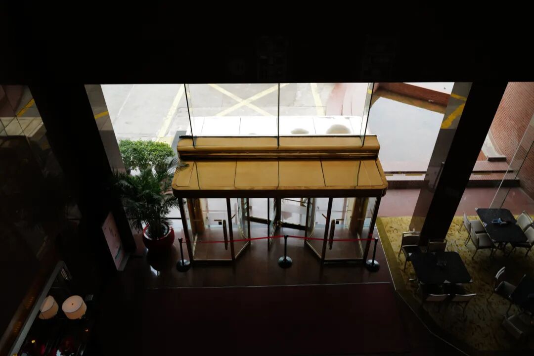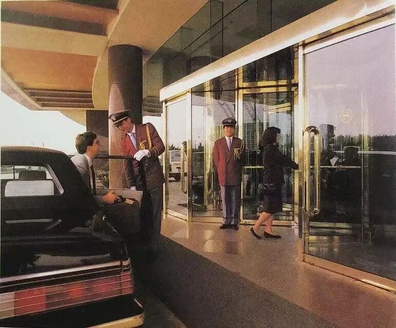 ▲ 金属边框和大块玻璃构成的挡风门今昔,昔日有着喜来登S Logo“窗花”和身着红色制服和礼帽的门童驻守。