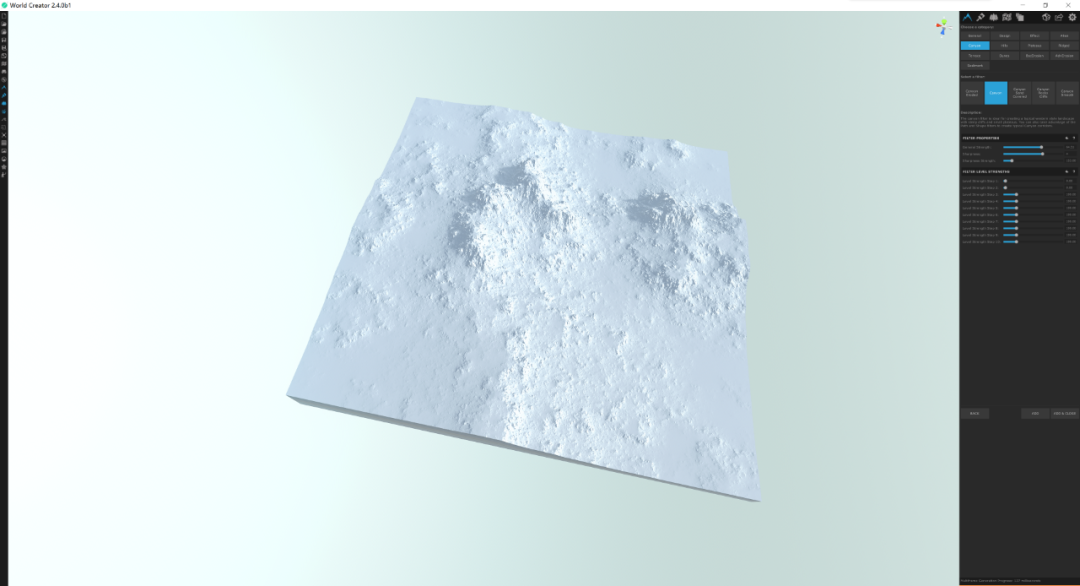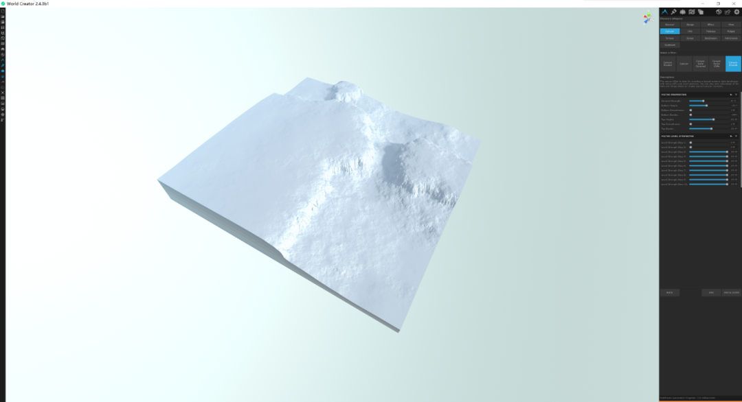 再就是Canyon Rocky Cliffs(带有岩石悬崖的峡谷)滤镜,这也是峡谷滤镜的另一种变体,它创造了带有岩石悬崖的峡谷。并且带有额外的泥沙沉积使这个滤镜看起来非常不错,可以创造另一种西式景观。当然,它也非常适合冰雪覆盖的冬季景观。