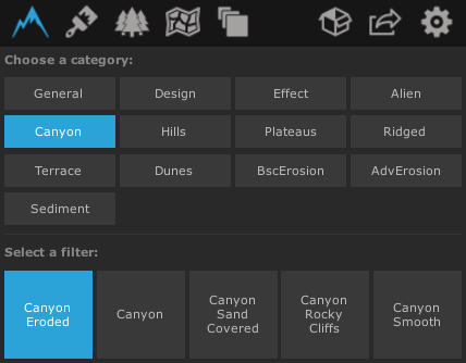 顾名思义这组滤镜主要是用来创建峡谷非常合适了,这里面一共有5个小滤镜:Canyon Eroded,Canyon,Canyon Sand Covered,Canyon Rocky Cliffs,Canyon Smooth。