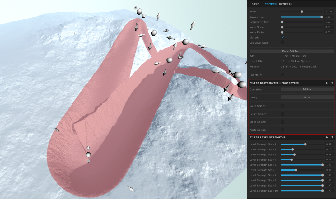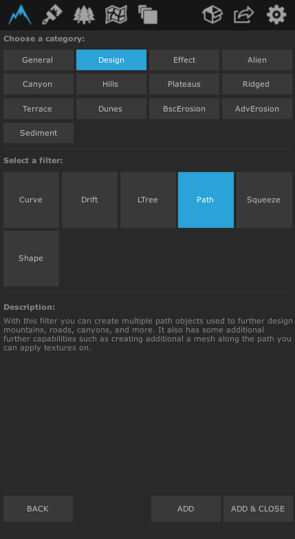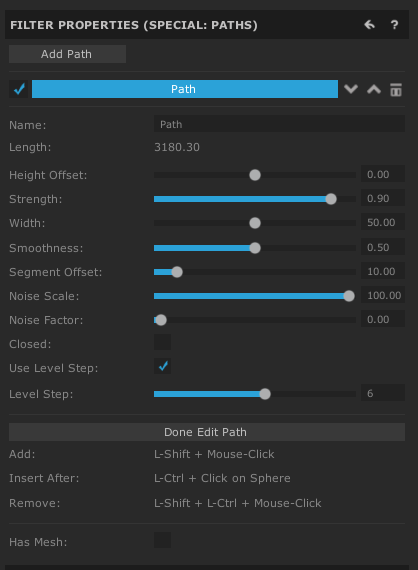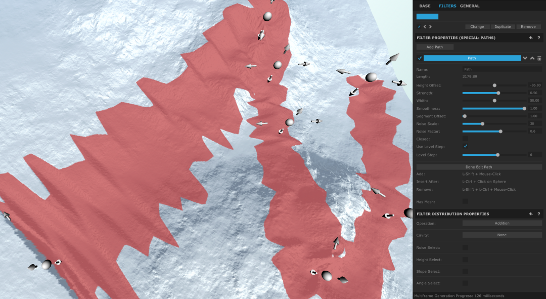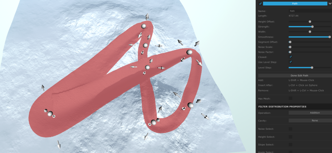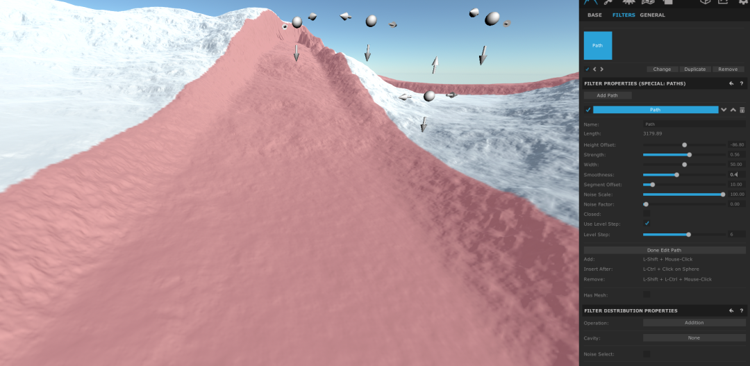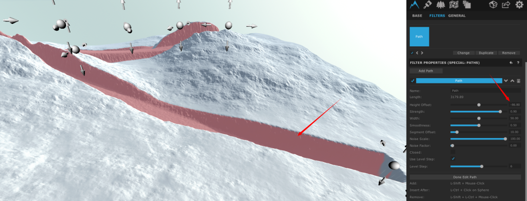 Path路径滤镜的主要功能就是通过绘制路径,可以很方便的创建道路,河流,峡谷等,为整体山体添加细节。