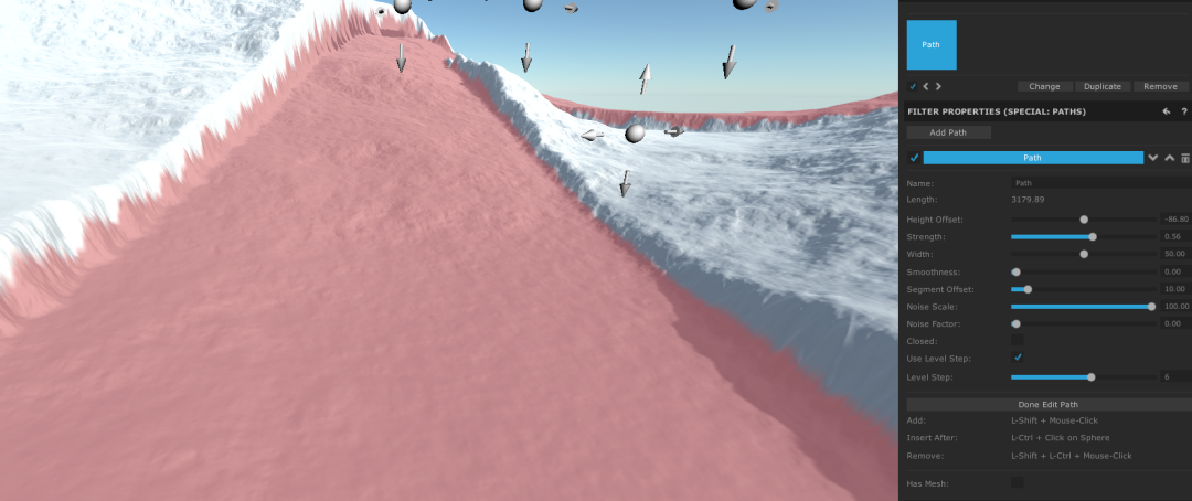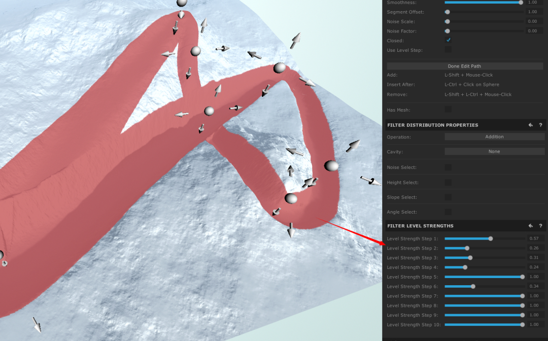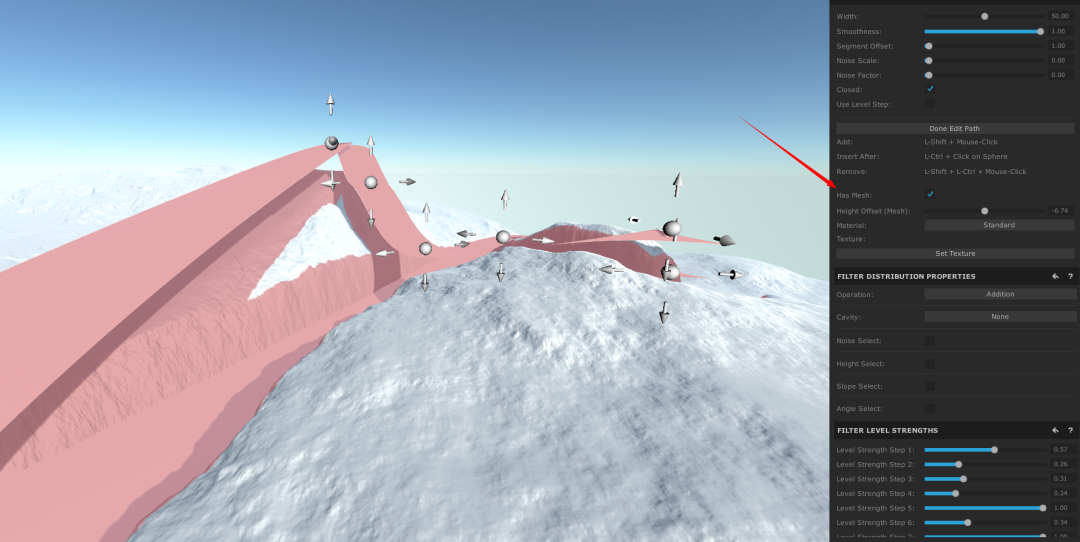Use Level Step(使用分层)和Level Step(分层),这两个数值主要控制路径与山体上的细节层级的融合强度。