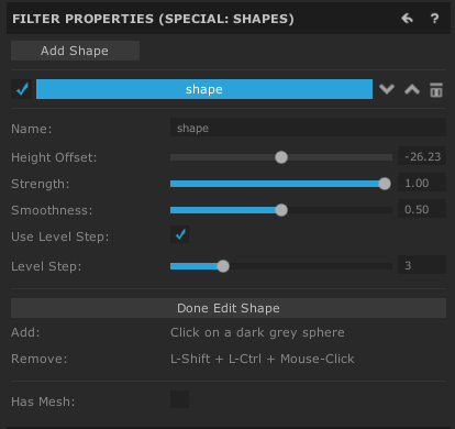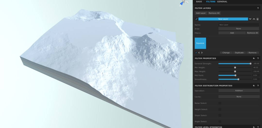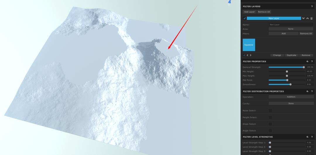 通过这个滤镜可以很方便的在地形上创建一个形状出来,然后控制其高度,在制作湖泊的时候,非常实用。