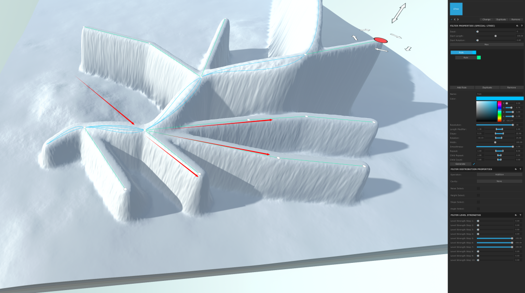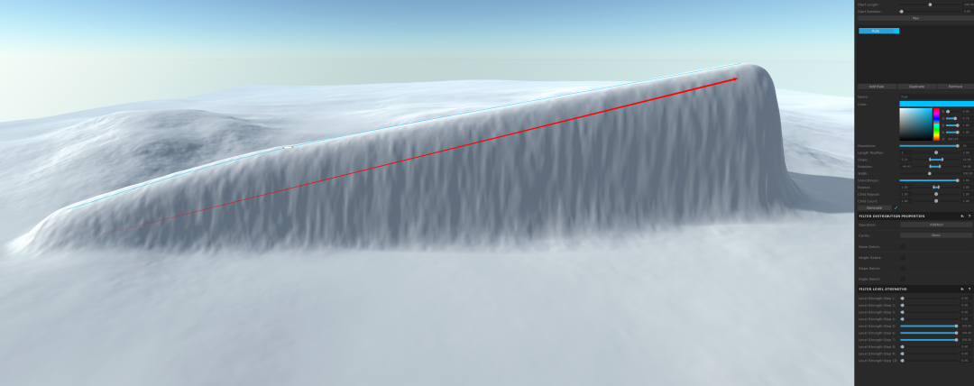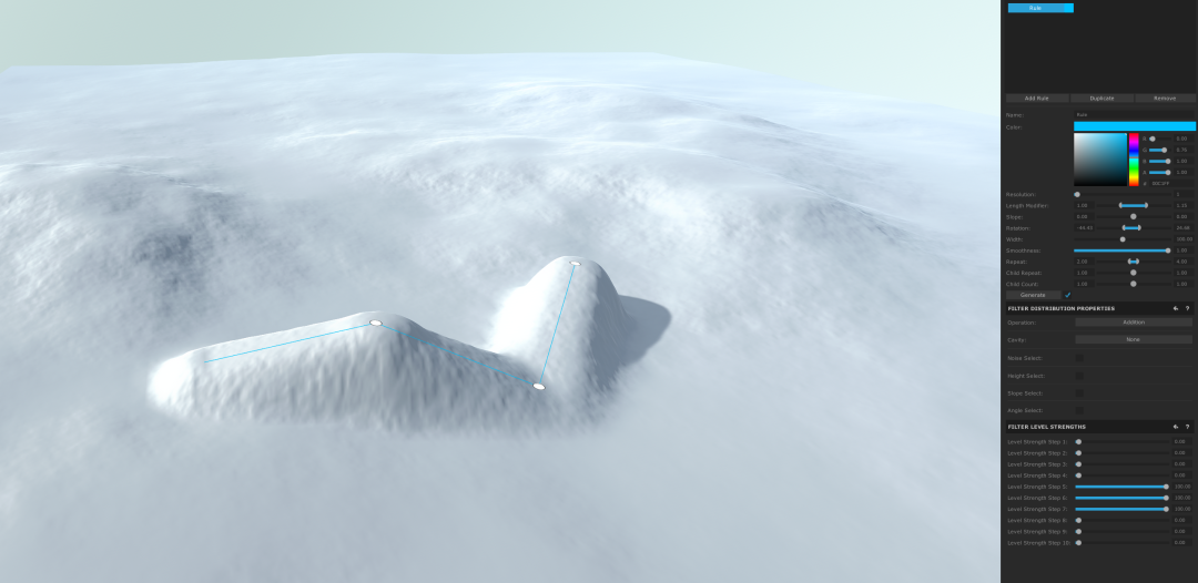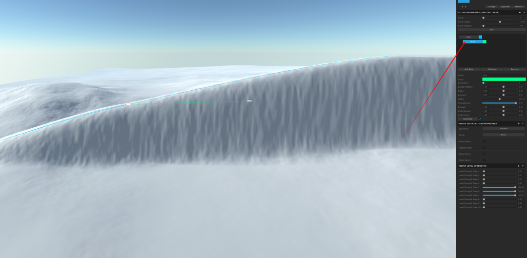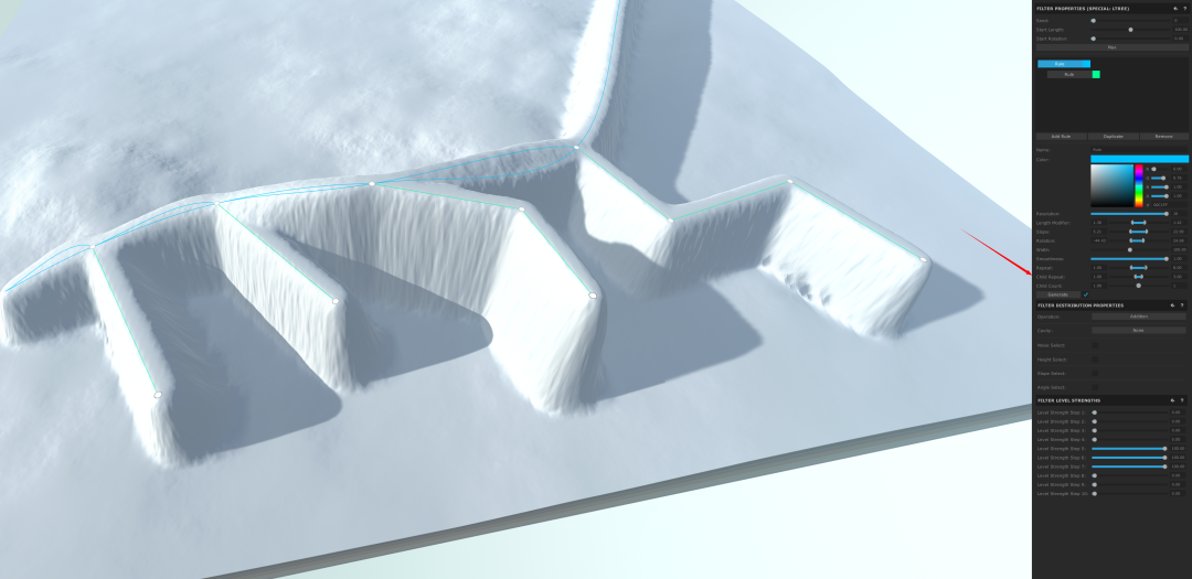 这里需要注意的是添加之后山体的零点处有一根调节线,这个就是你添加的L树规则(下文简称为L线)。