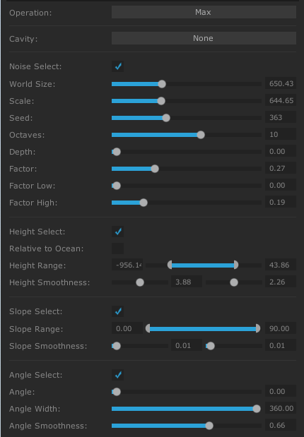 Noise Select,Height Select,Slope Select,Angle Select这些属性都是对现有的效果进行细节调整,大家可以滑动参数即可。但是这种可以混合一些其他的滤镜就可以实现,而且效果更好,速度更快。