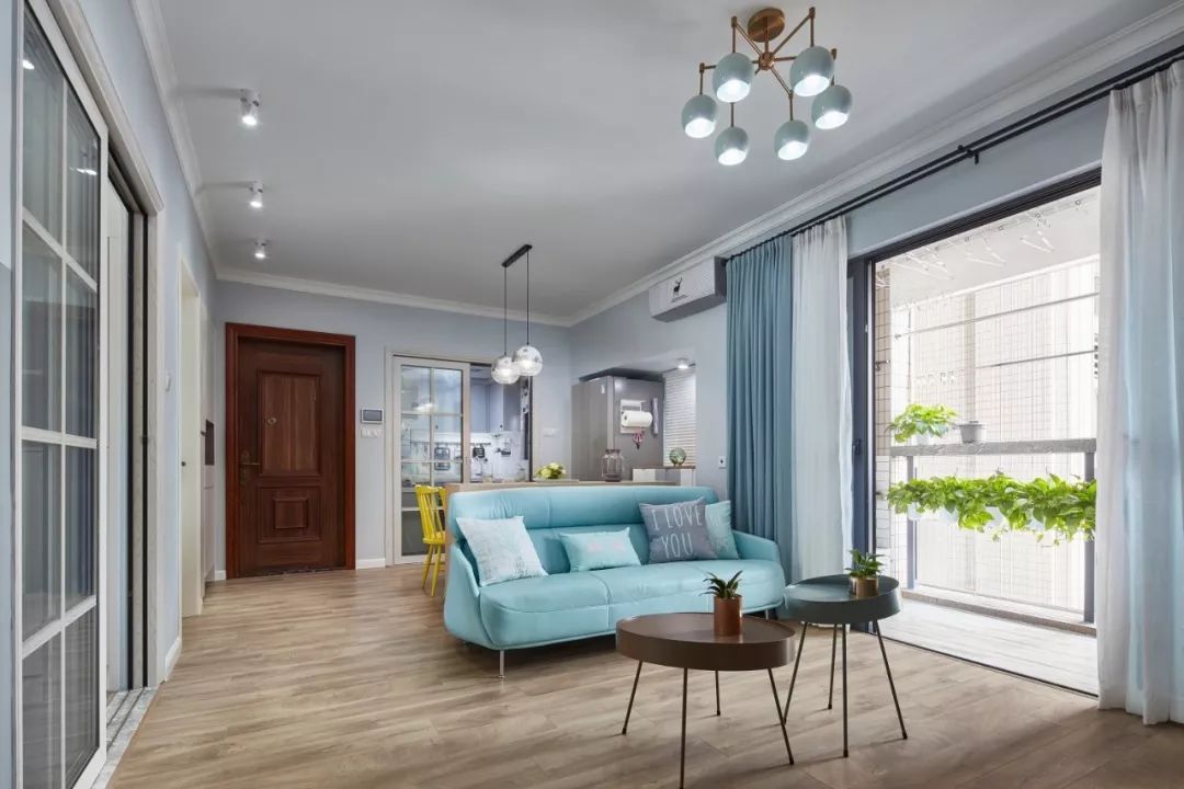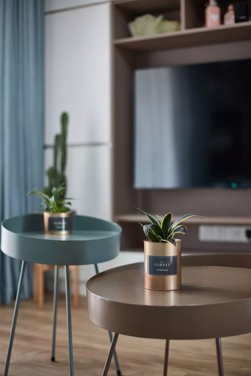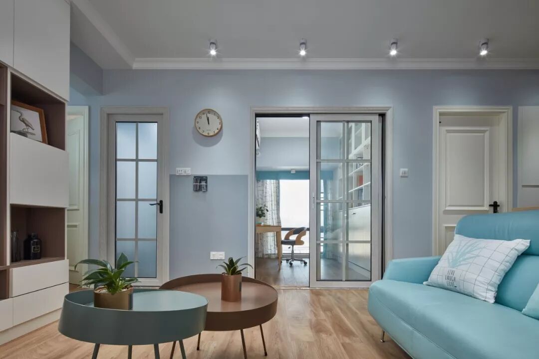 浅蓝色的小沙发格外吸晴,让人觉得很温馨。电视背景墙是嵌入式收纳柜设计,把电视机融入其中,大方又实用。